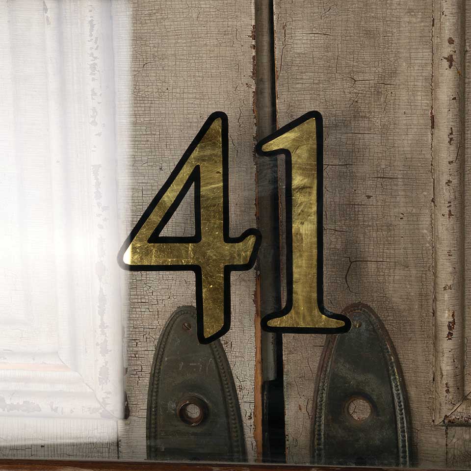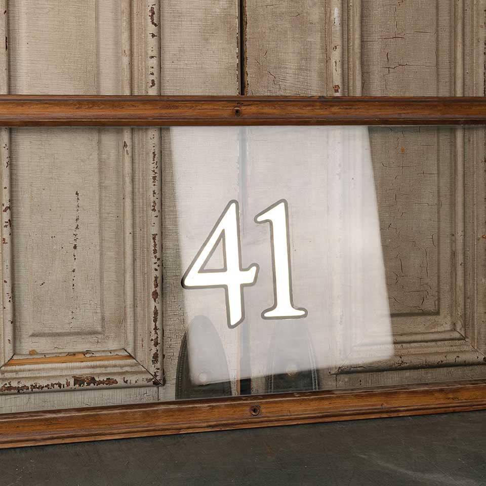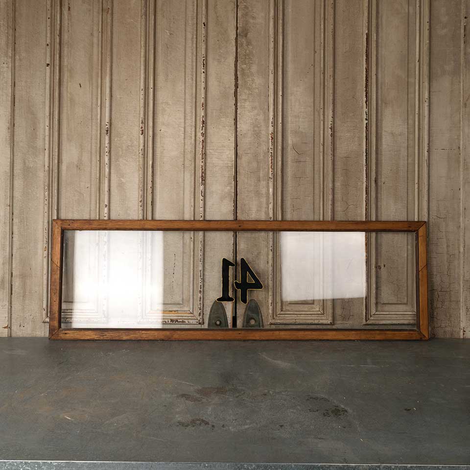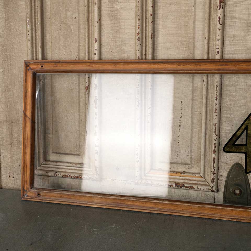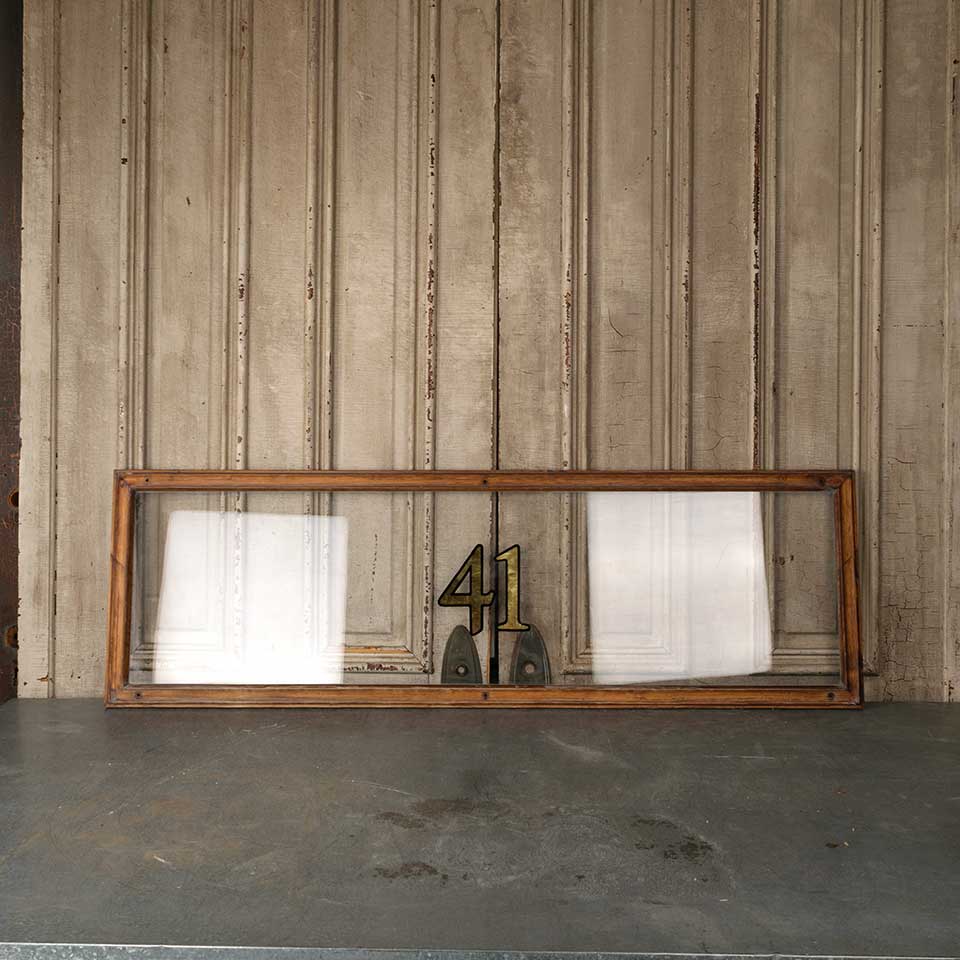 Architectural salvage vintage wood transom window storm panel with 41 address numbers measuring approx. 55" wide x 17 1/2" tall x 1 1/8" front to back. See photos to evaluate condition.