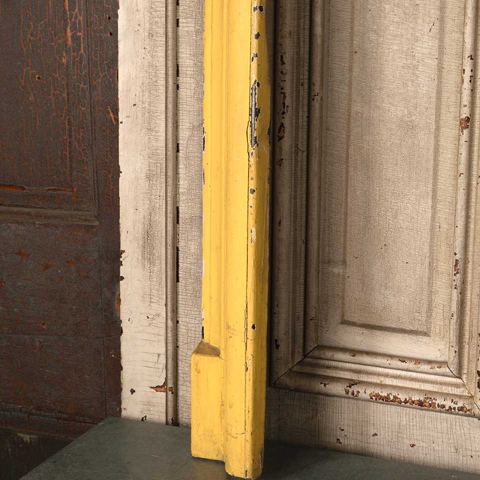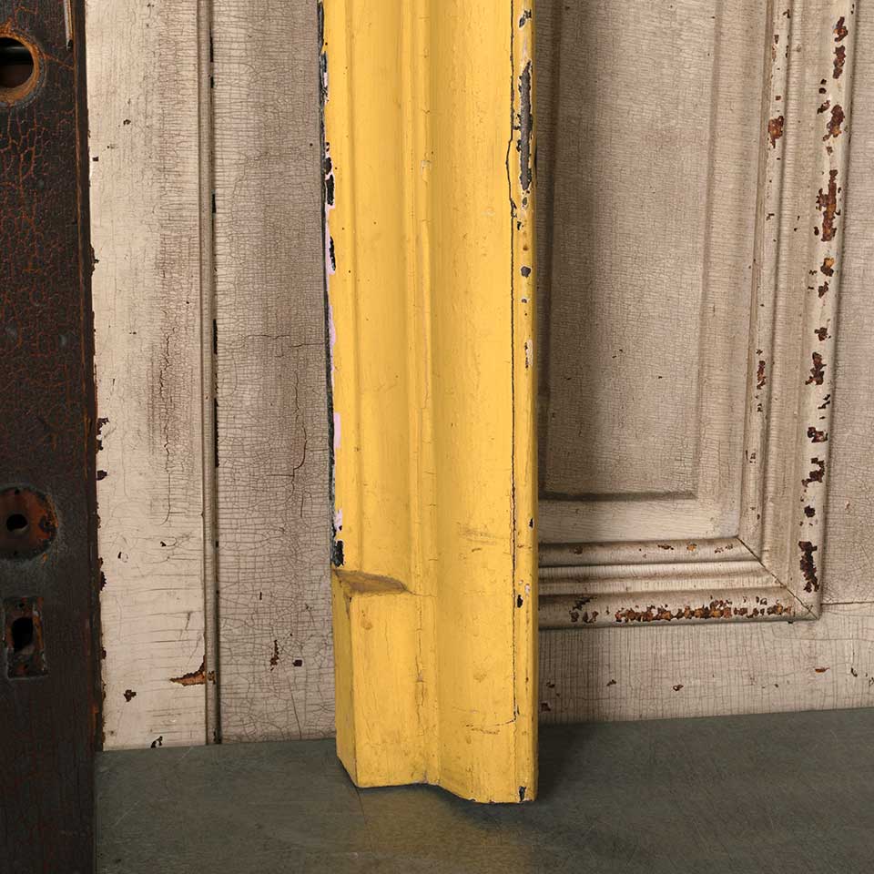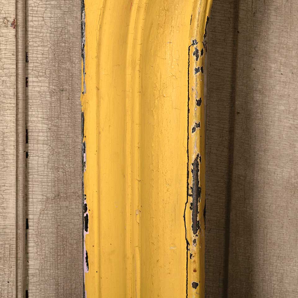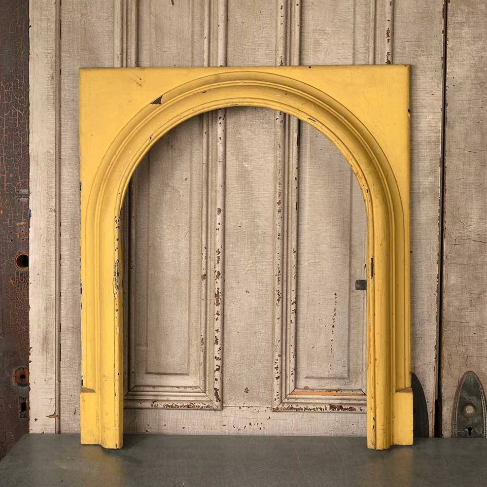 Architectural salvage antique painted cast iron fireplace surround with an arched top opening measuring approx. 28 1/8" wide x 31 3/4" tall x 3 1/2" front to back. The interior firebox opening measures approx. 20" wide x 27 7/8" tall. The interior left tab is missing and there's a vertical crack at that location. See photos to evaluate condition.
