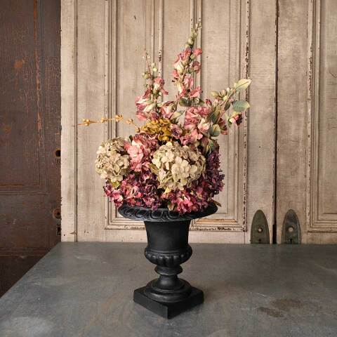Cast iron garden urn planter with fake flower arrangement measuring approx. 12" in diameter x 12 1/2" tall (32" including arrangement) with a 5 3/4" x 5 3/4" base. See photos to evaluate condition.