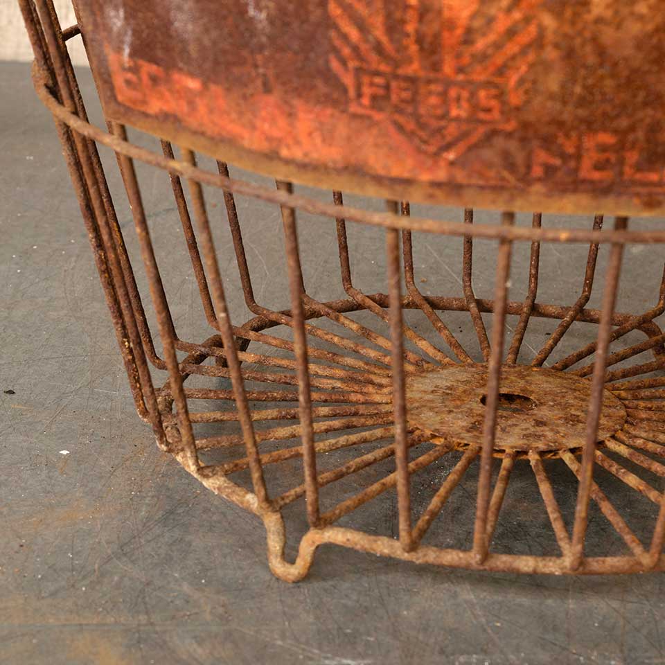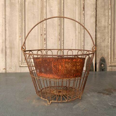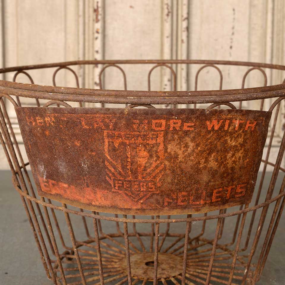 Antique metal wire farm egg basket measuring approx. 14 1/4" in diameter x 10" tall. See photos to evaluate condition.
