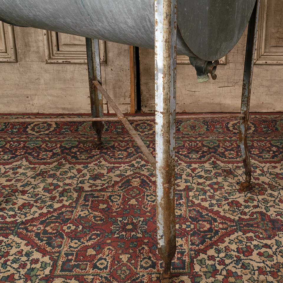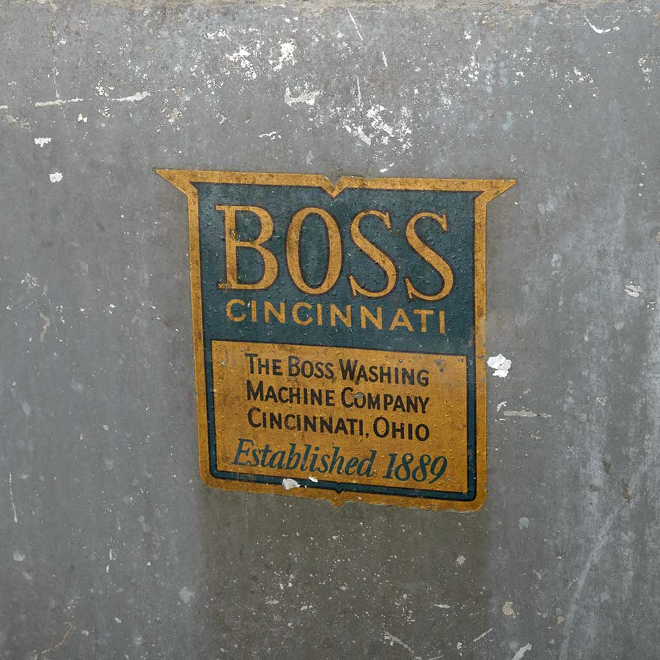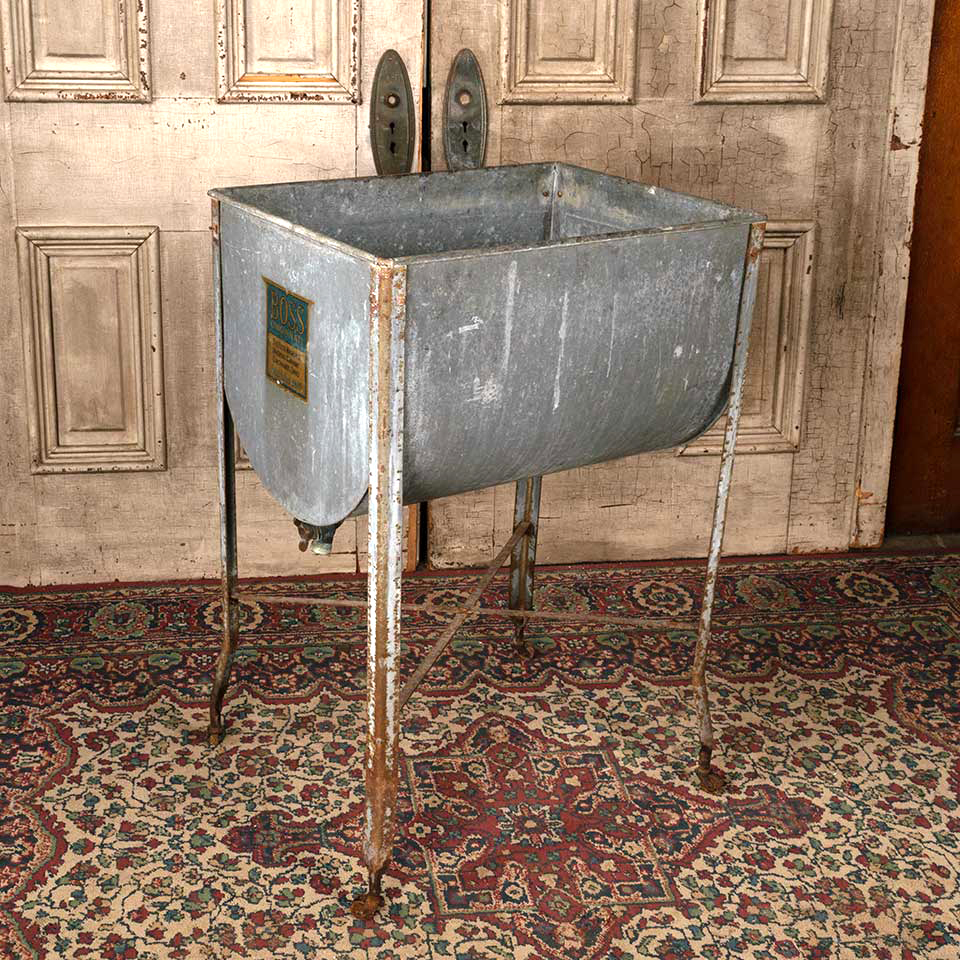 Architectural salvage antique BOSS single bowl galvanized metal washtub on casters measuring approx. 23 1/4" wide x 33 1/4" tall x 18 3/4" front to back. The original label reads: "BOSS CINCINNATI THE BOSS WASHING MACHINE COMPANY CINCINNATI, OHIO Established 1889." See photos to evaluate condition.