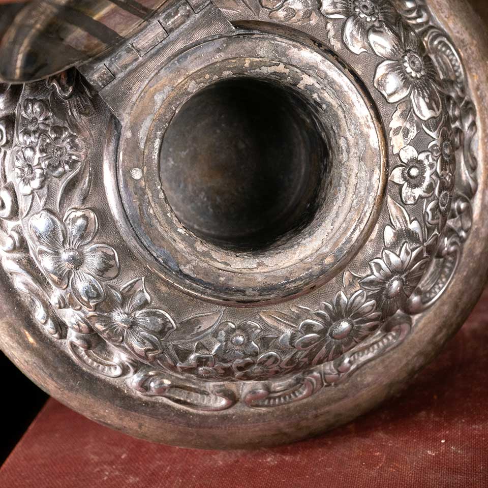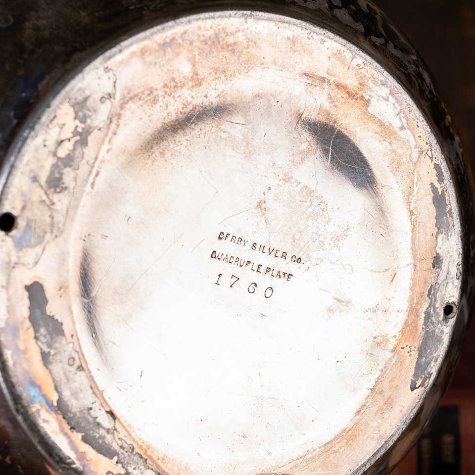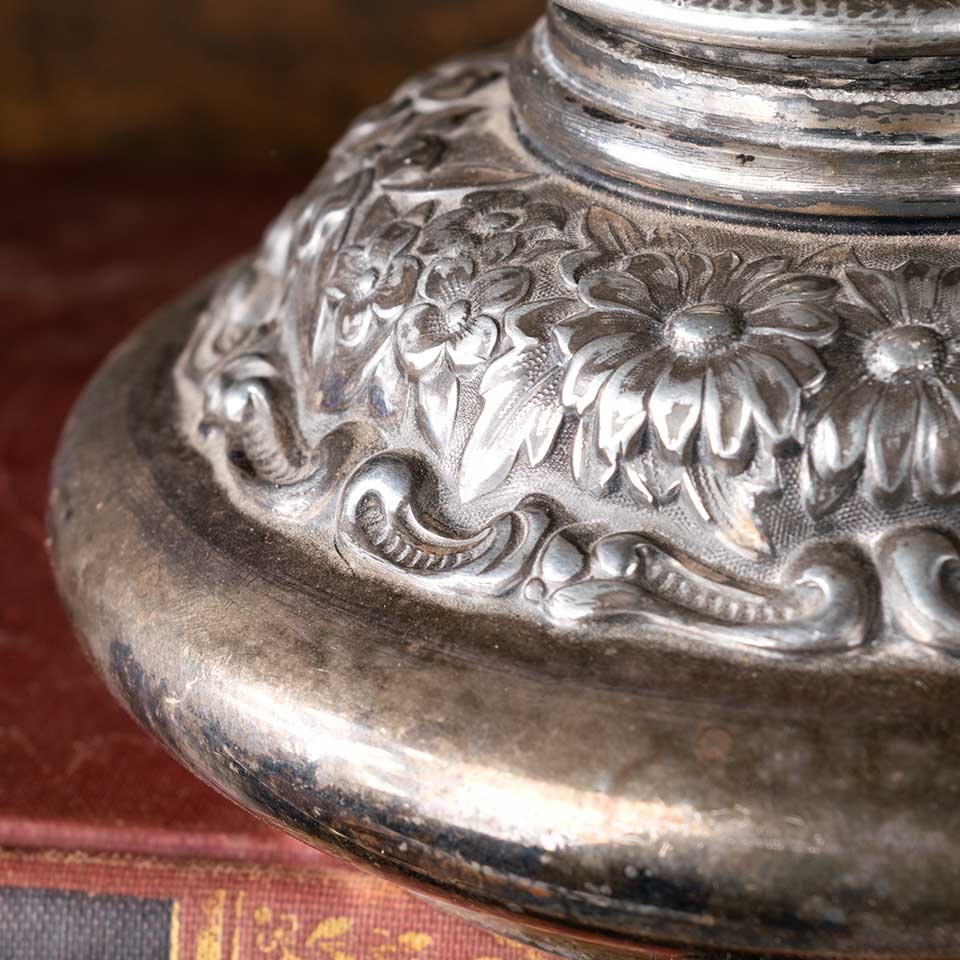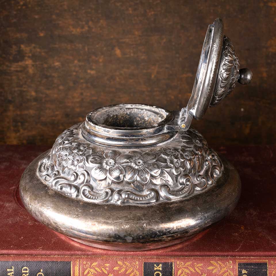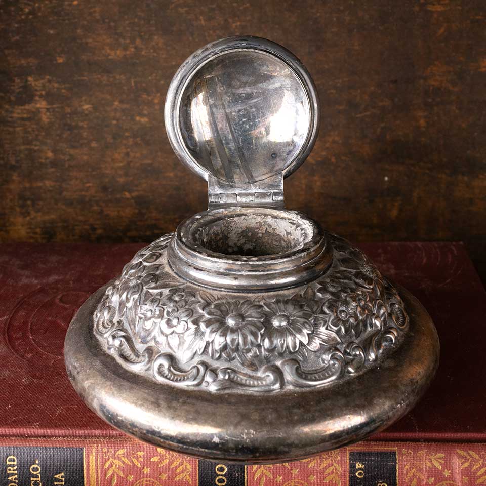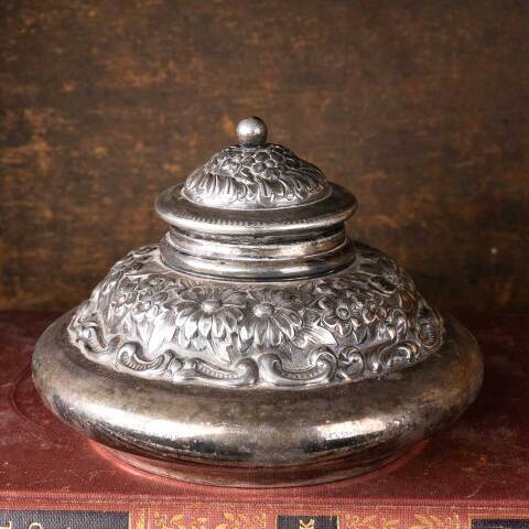 Antique Derby Silver Co. silver plated ink well with an ornate floral pattern measuring approx. 4 1/2" in diameter x 3" tall. See photos to evaluate condition.