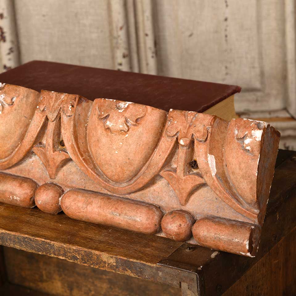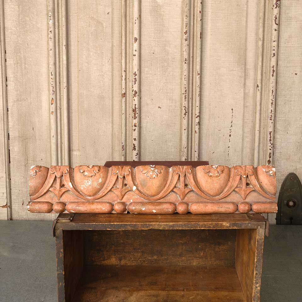Architectural salvage antique cast plaster interior building ornament with egg and dart motif measuring approx. 17" wide x 3 1/8" tall x 1 1/8" front to back. See photos to evaluate condition.