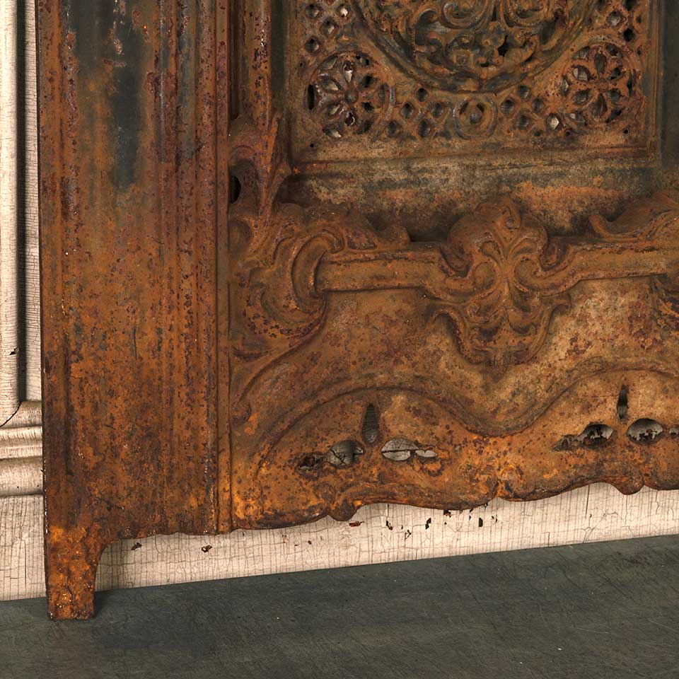Architectural salvage antique ornate arched top cast iron fireplace summer front cover measuring approx. 19 13/16" wide x 27 7/8" tall x 2 1/2" front to back. See photos to evaluate condition.