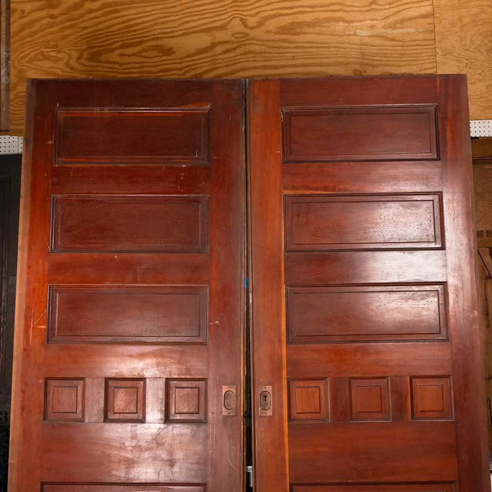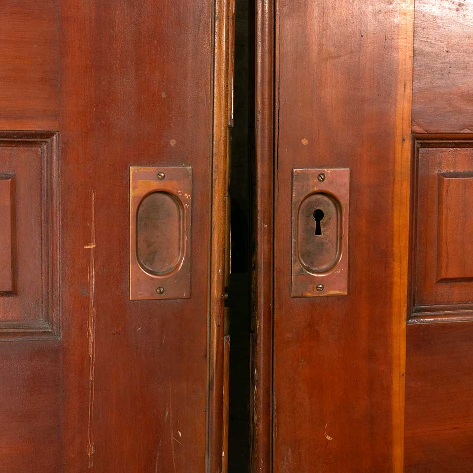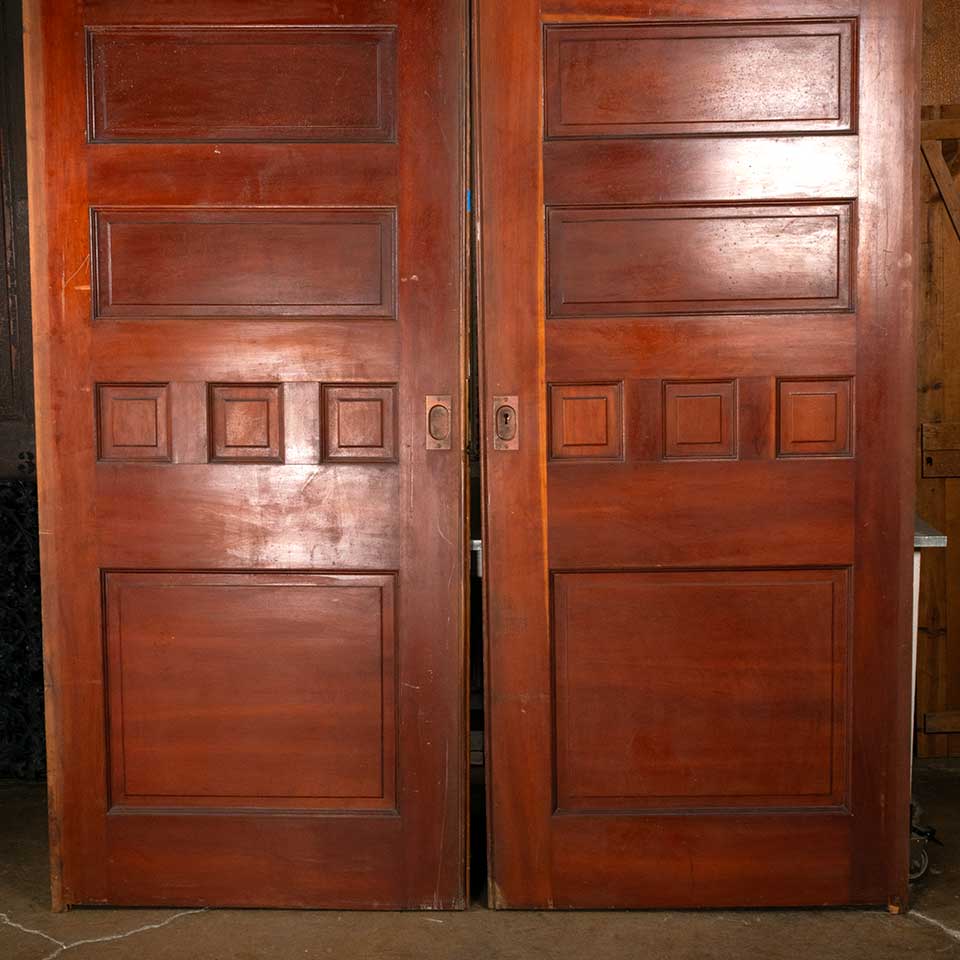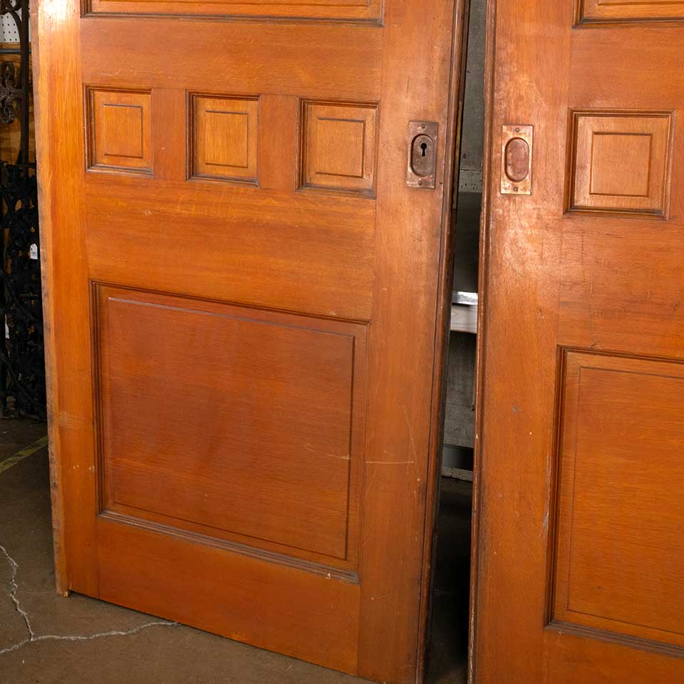 Set of two architectural salvage antique wood pocket doors with functional lock and handle hardware together measuring approx. 73 7/8" wide x 95 1/2" tall x 1 3/4" front to back. The key for the mortise lock is included. See photos to evaluate condition. Priced at $3,500 for the two door set with the hardware.