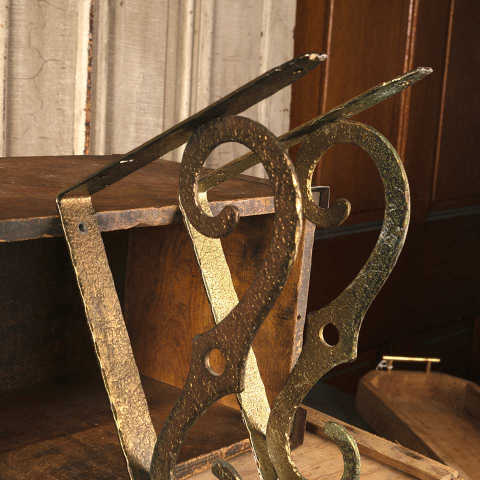 Set of two vintage hammered metal wall shelf brackets each measuring approx. 1" wide x 10" tall x 7 1/2" front to back. See photos to evaluate condition.