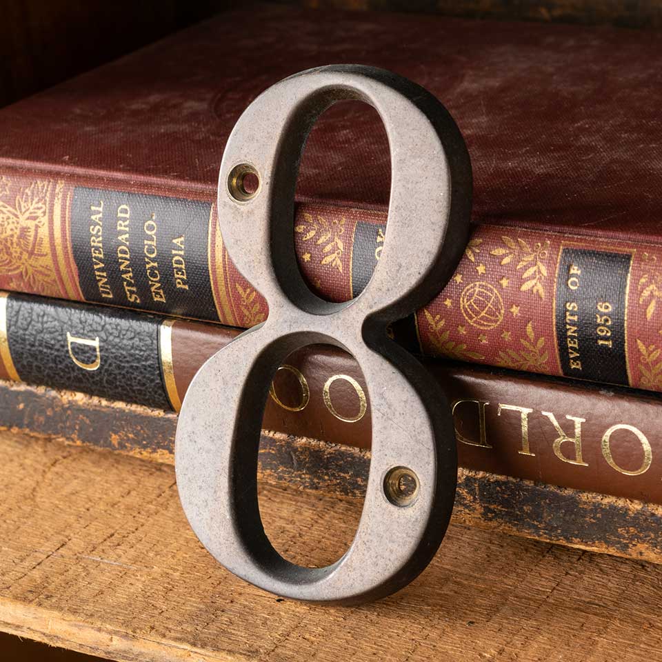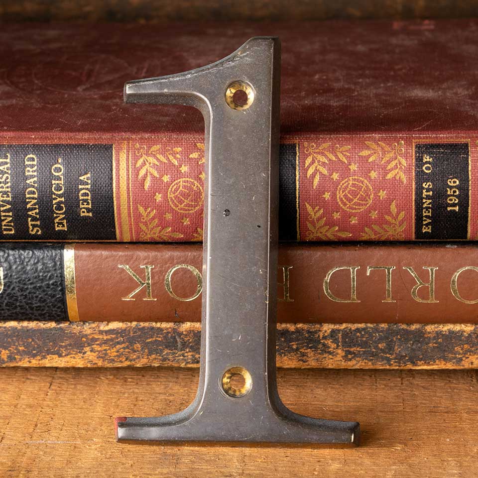 Salvaged vintage brass address numbers each measuring 2 3/8" wide x 4" tall x 1/4" thick. Numbers 0 1 2 3 4 5 6/9 7 8 available, please contact us for quantities. Color and condition vary. Priced at $4/each.
