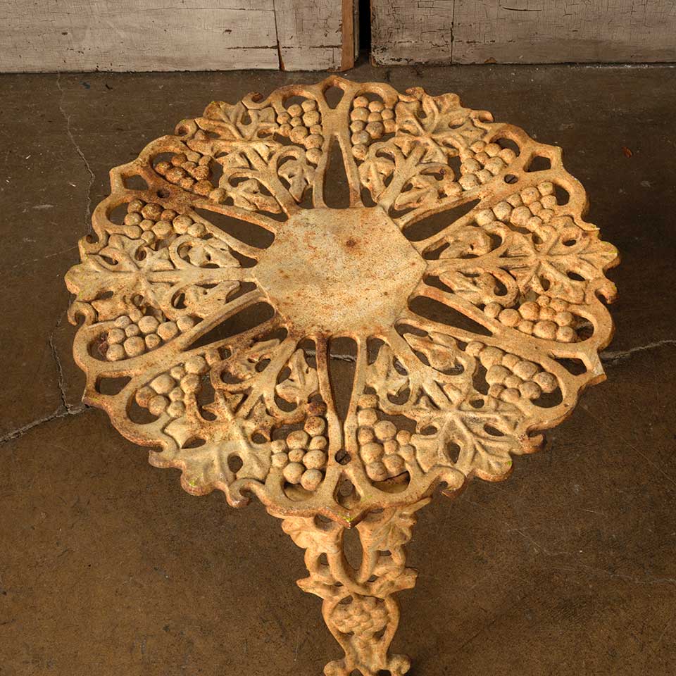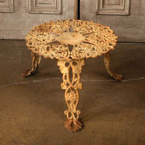 Architectural salvage vintage painted cast iron garden patio table with grape motif measuring approx. 14" tall with a 20" diameter top and a 28" diameter base. See photos to evaluate condition.