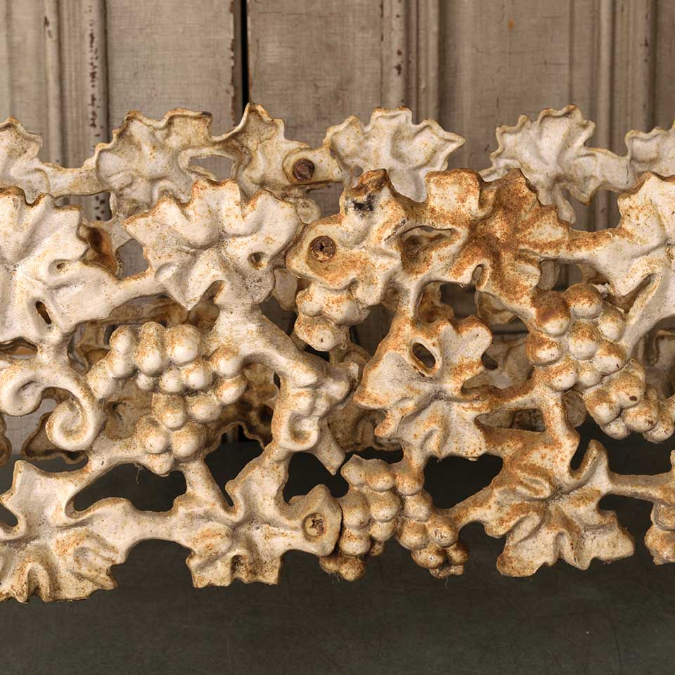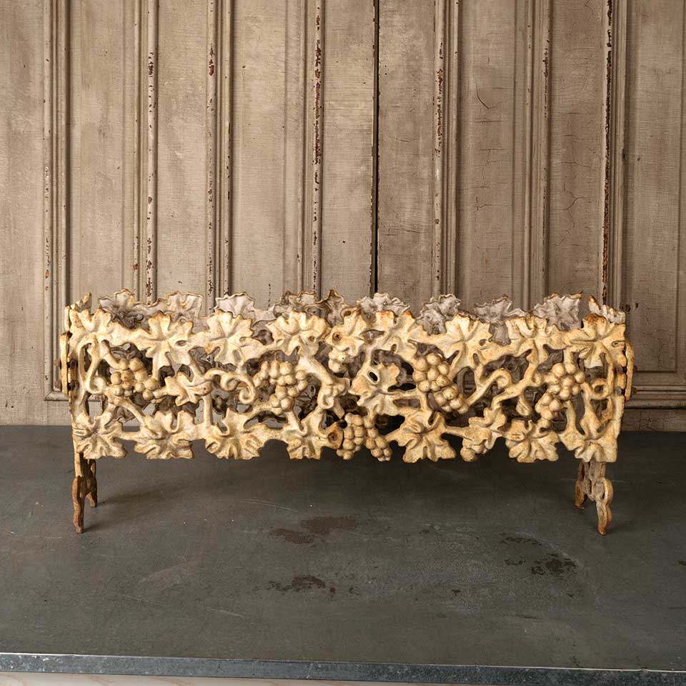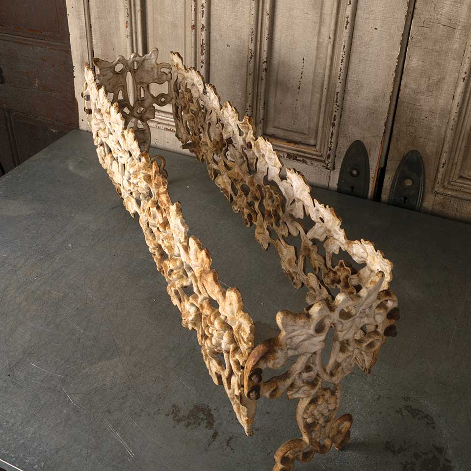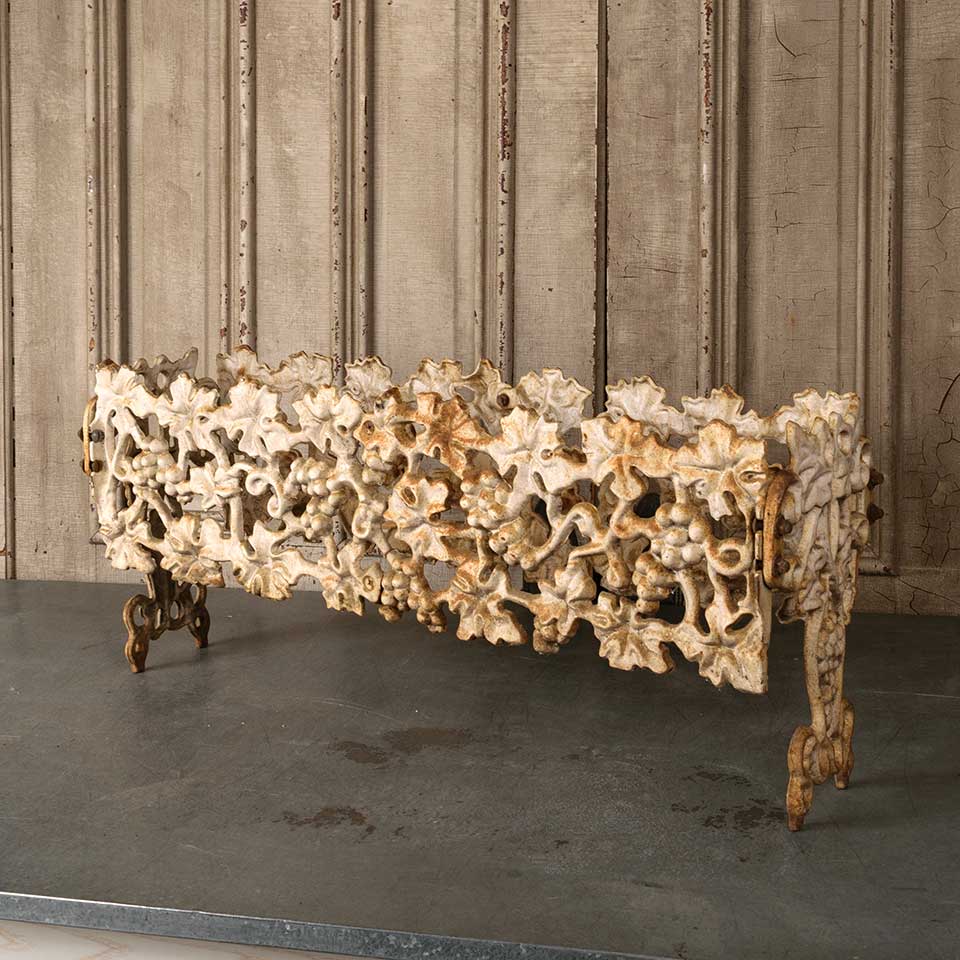 Architectural salvage vintage cast iron garden patio planter frame measuring approx. 33 1/2" wide x 14 1/2" tall x 9" front to back. The bottom panel is missing. See photos to evaluate condition.