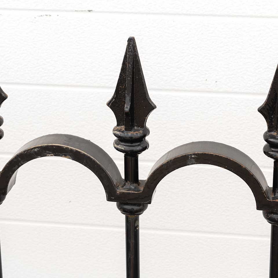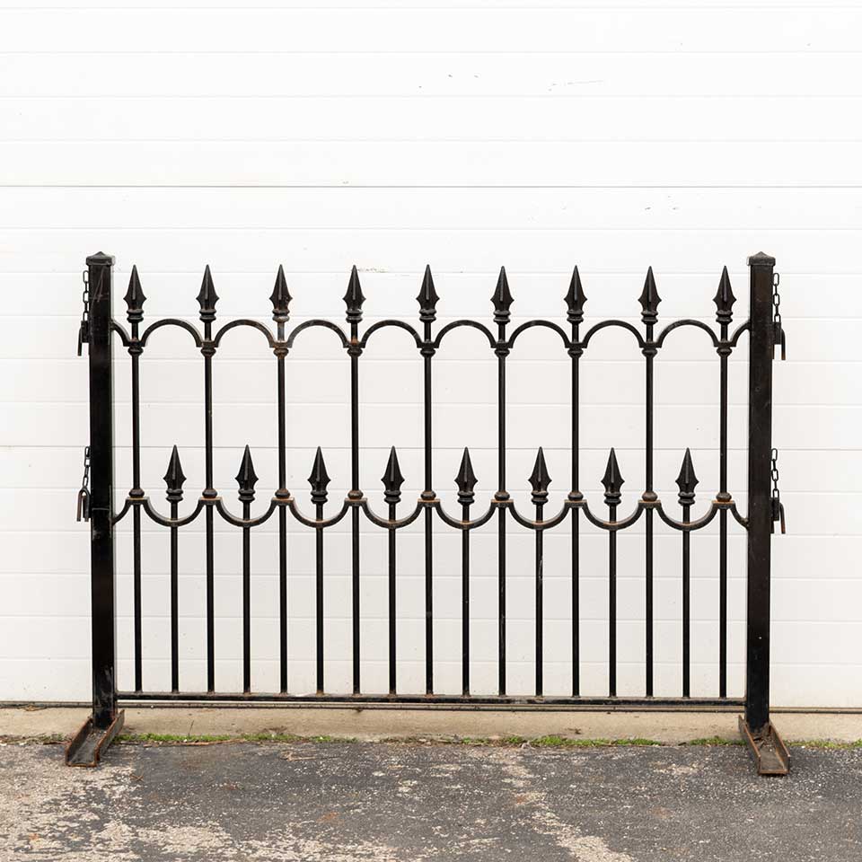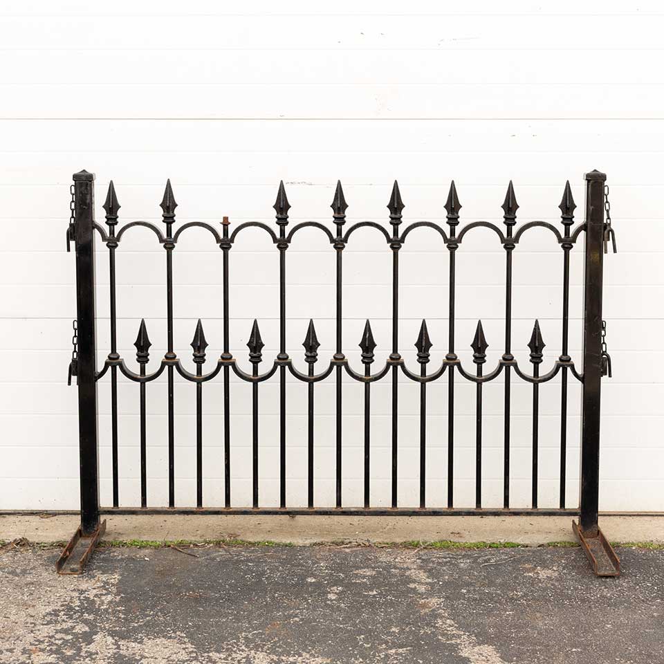 Architectural salvage freestanding iron fence panel from the Ohio Statehouse measuring approx. 60 3/4" wide x 43" tall x 2" front to back with a 16" foot. These are not antique but were fabricated to mimic the antique fencing around the Statehouse grounds and were used as movable barriers. One panel is missing a finial. Color and condition may vary.