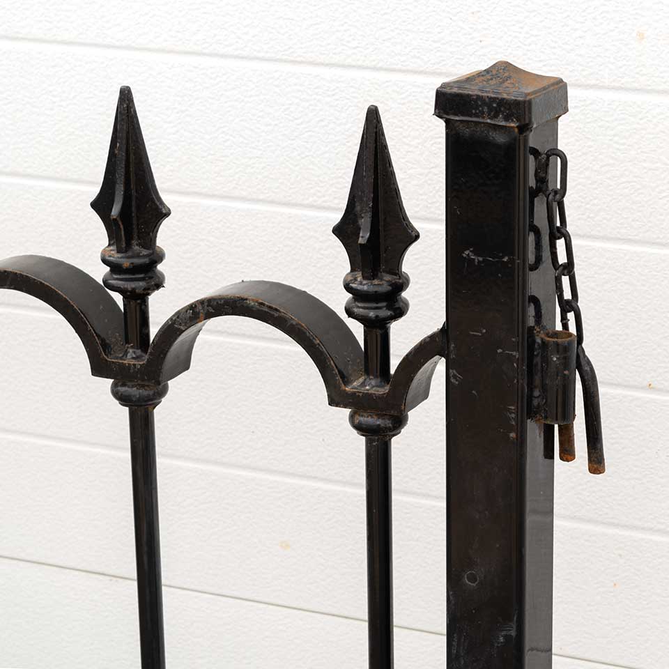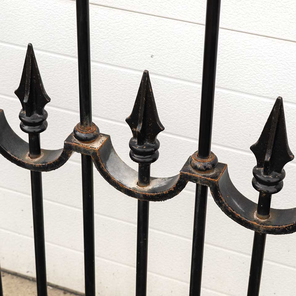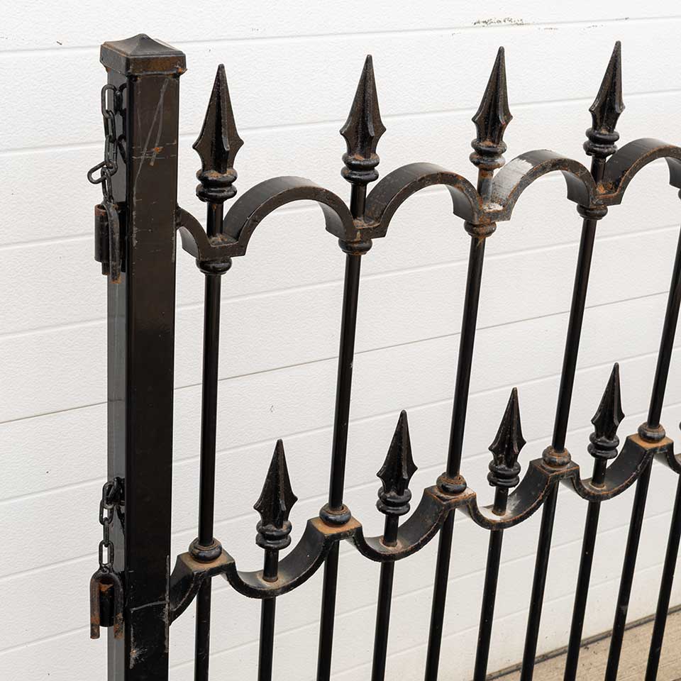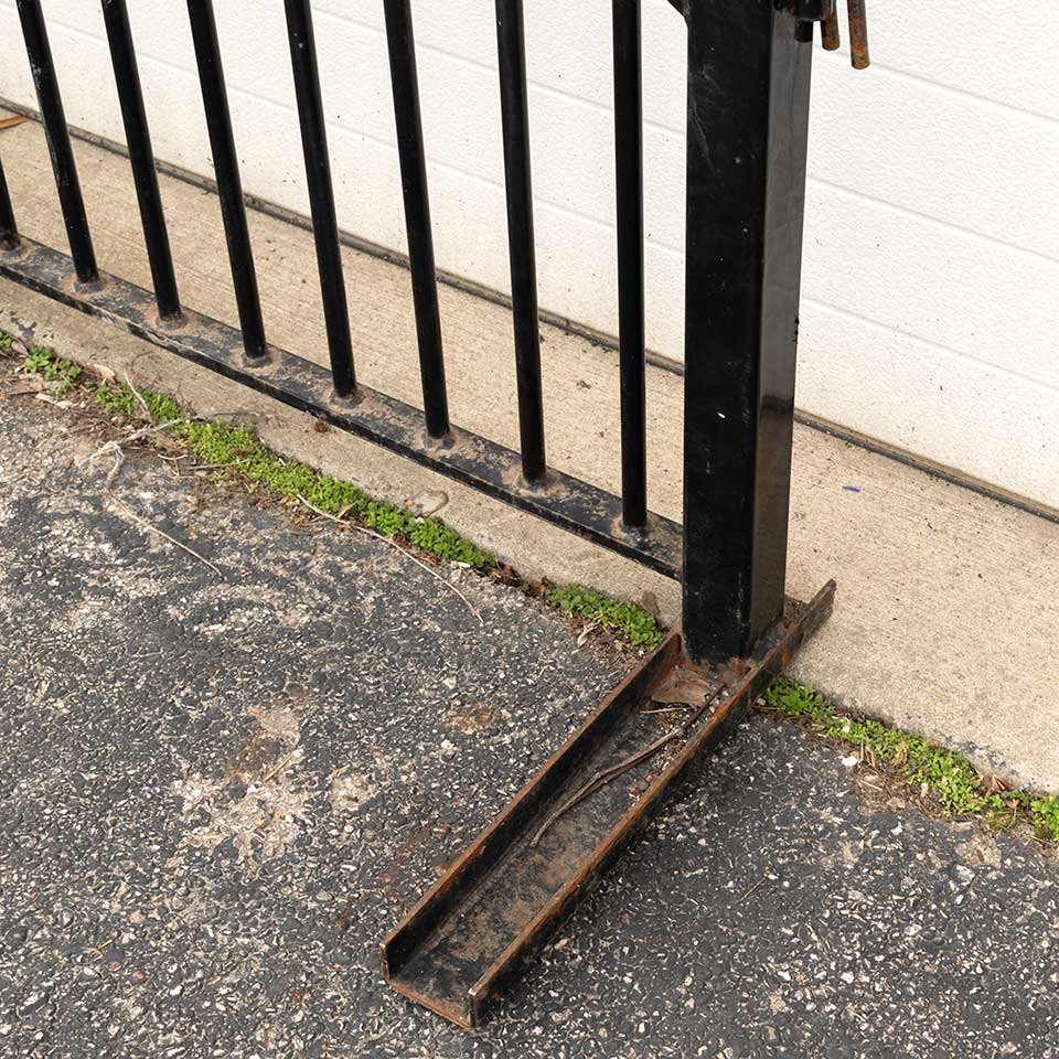 Architectural salvage freestanding iron fence panel from the Ohio Statehouse measuring approx. 60 3/4" wide x 43" tall x 2" front to back with a 16" foot. These are not antique but were fabricated to mimic the antique fencing around the Statehouse grounds and were used as movable barriers. One panel is missing a finial. Color and condition may vary.