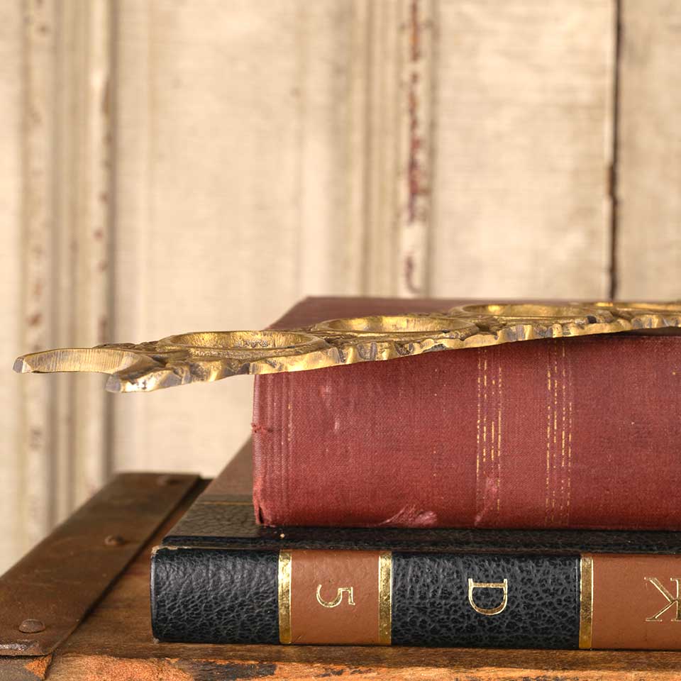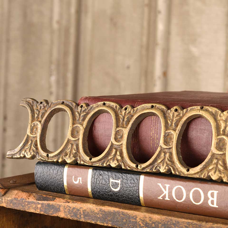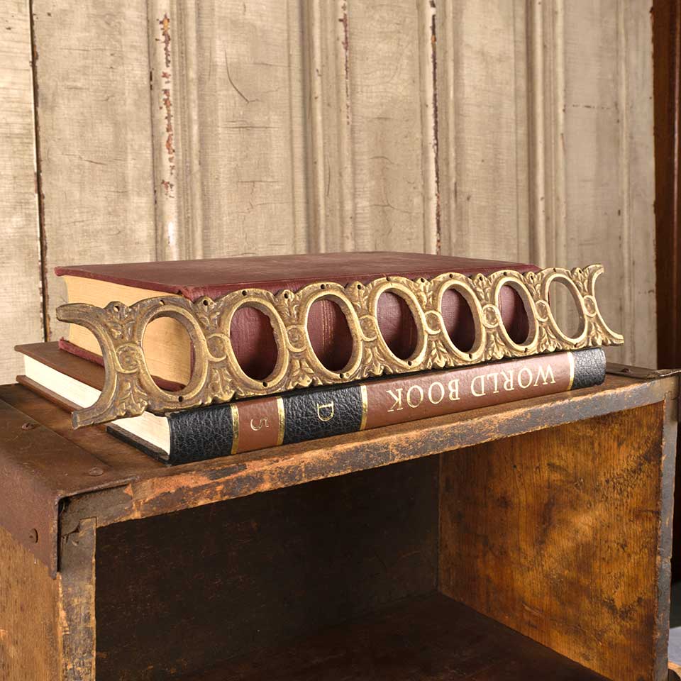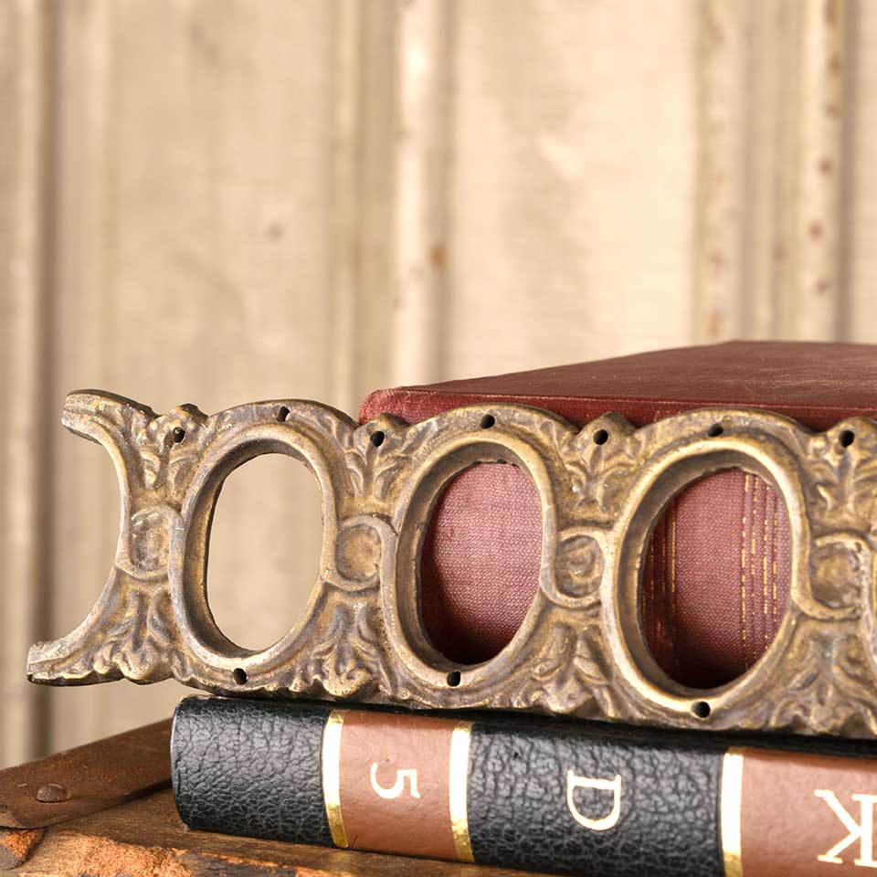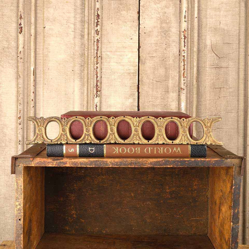 Architectural salvage ornate antique brass furniture mount trim panel measuring approx. 12 1/2" wide x 1 7/8" tall x 1/8" front to back. More available, please inquire.