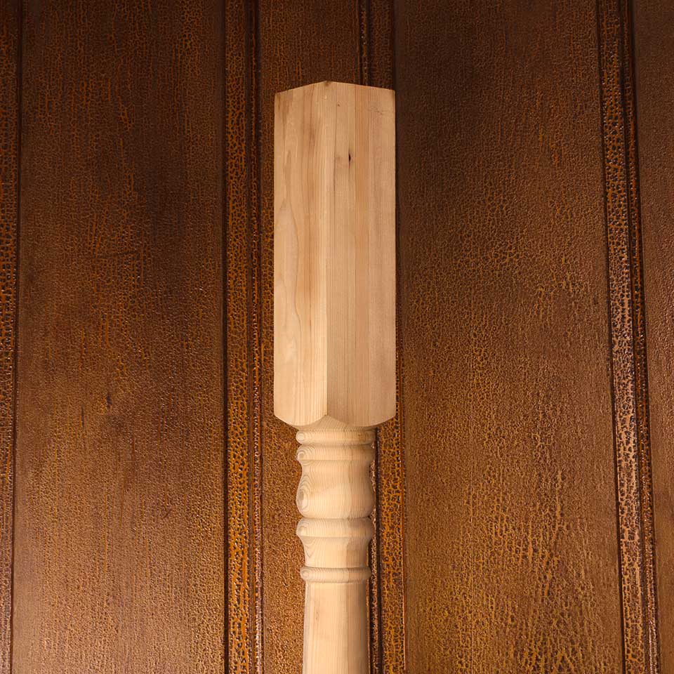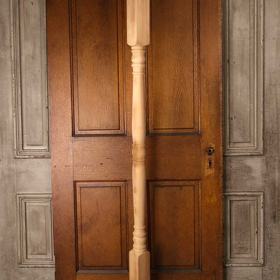 Architectural salvage never used turned wood post measuring approx. 3 1/4" x 3 1/4" x 72" tall. More available contact to inquire. Color and condition may vary.