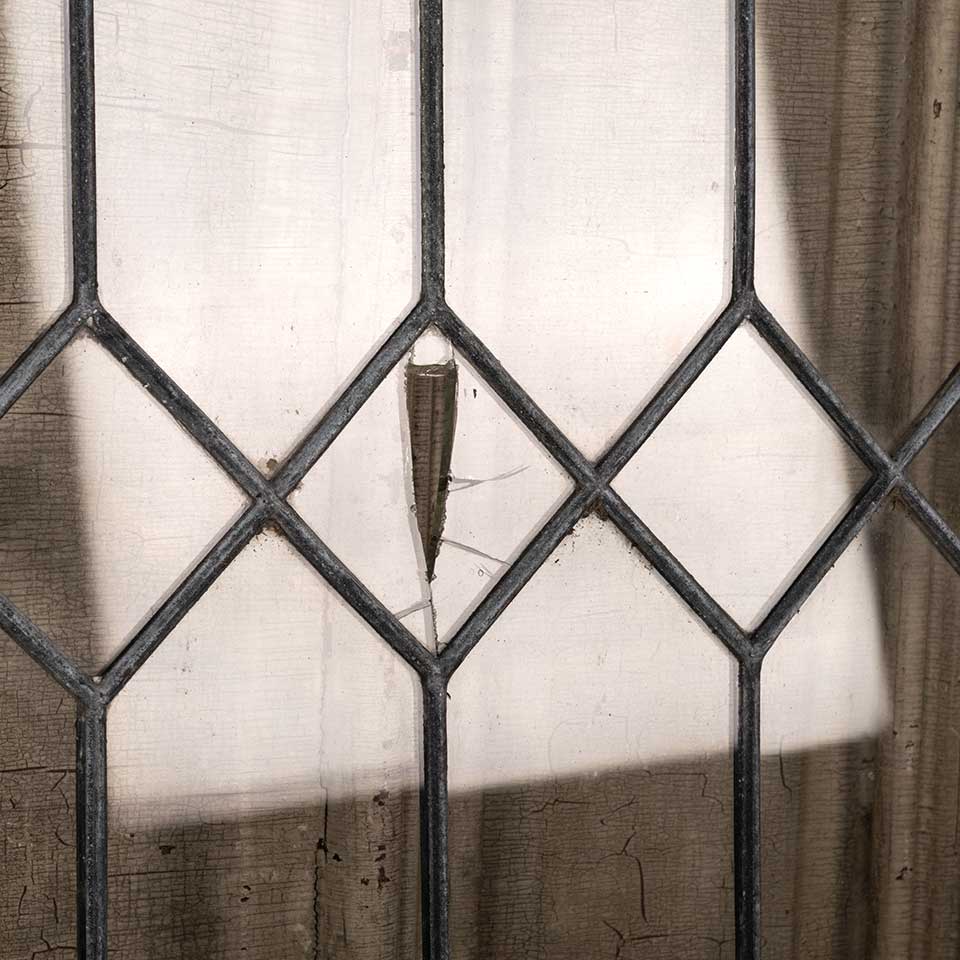 Architectural salvage antique leaded glass window sash measuring approx. 51 7/8" wide x 27 1/2" tall x 1 9/16" front to back. One pane is cracked and has missing glass and there's some wood loss. See photos to evaluate condition.