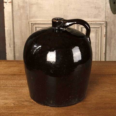 Antique primitive American salt glazed stoneware storage jug with handle measuring approx. 10" in diameter x 11 3/4" tall with a 1" diameter opening. It appears the spout has been repaired sometime in the past. See photos to evaluate condition.