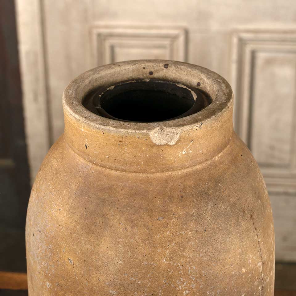 Antique primitive American stoneware crock canning storage jar measuring approx. 5 3/4" in diameter x 8 7/8" tall with a 1 7/8" diameter opening. There are some chips on the base and one on the top rim. See photos to evaluate condition.