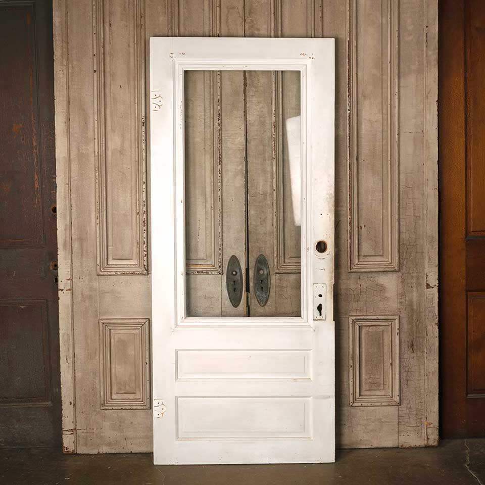 Architectural salvage antique Victorian half lite painted wood entry door measuring approx. 33 3/4" wide x 78 1/2" tall x 1 3/8" thick. There's a hole where a modern deadbolt lock had been installed. See photos to evaluate condition.