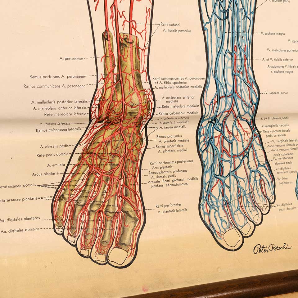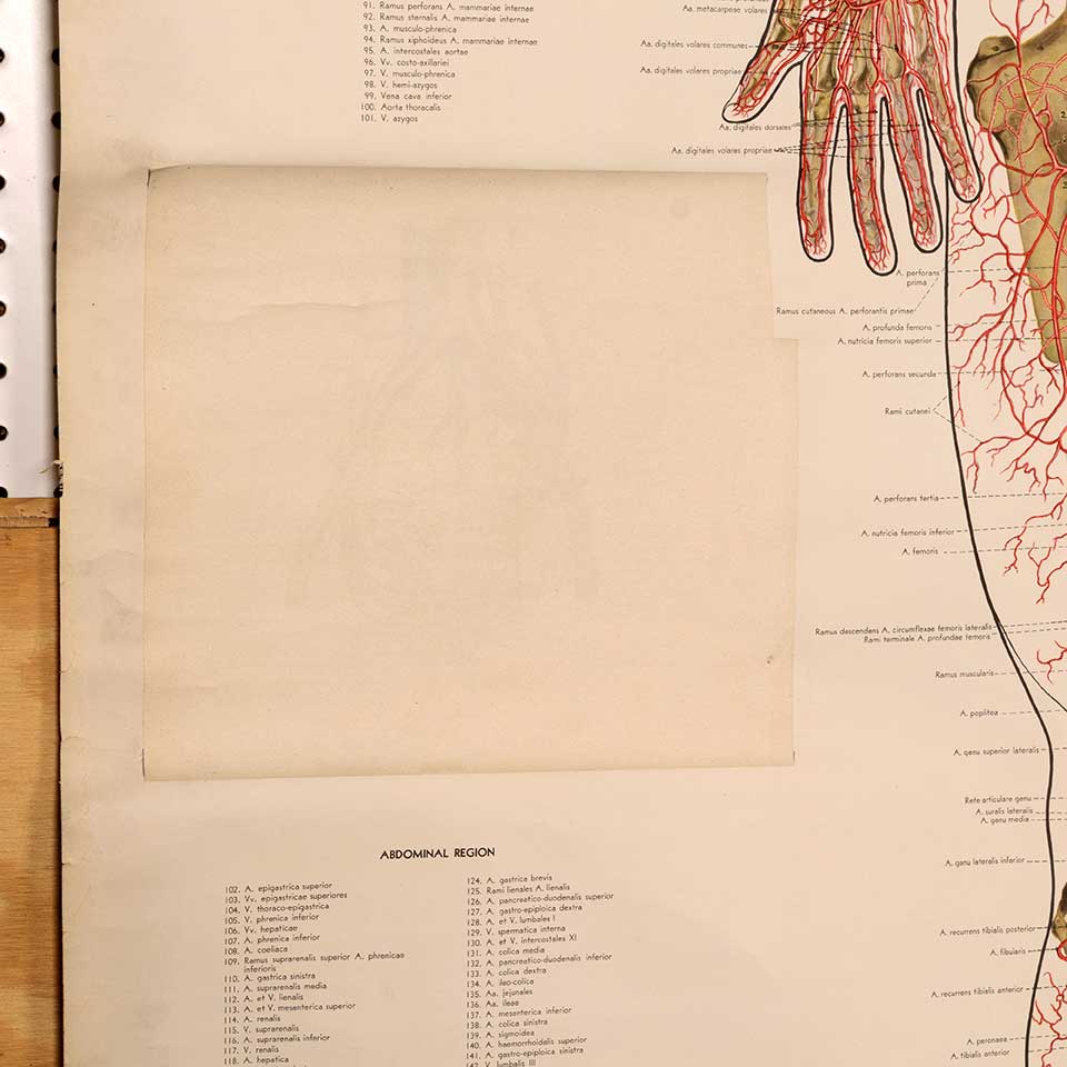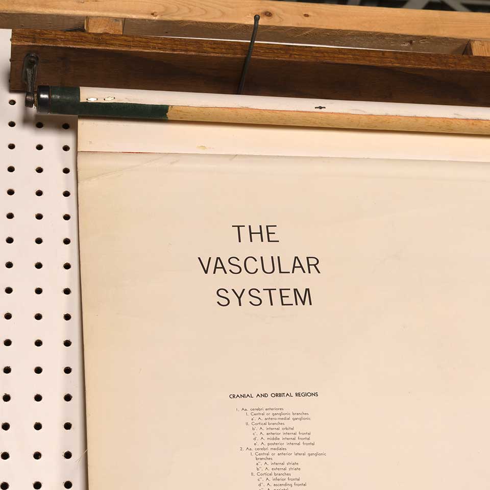 Vintage school classroom pull-down map of Human Vascular System (circulatory system chart) medical map measuring approx. 39 1/4" x 67" tall x 3" front to back. This map was published by Associated Anatomists, Chicago copyright 1937. See photos to evaluate condition.
