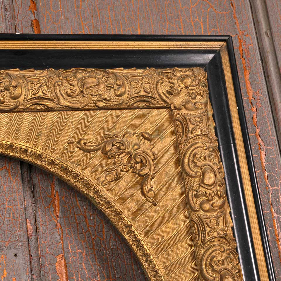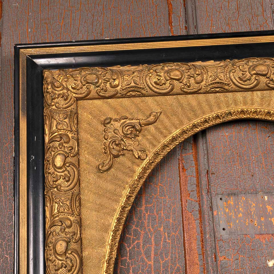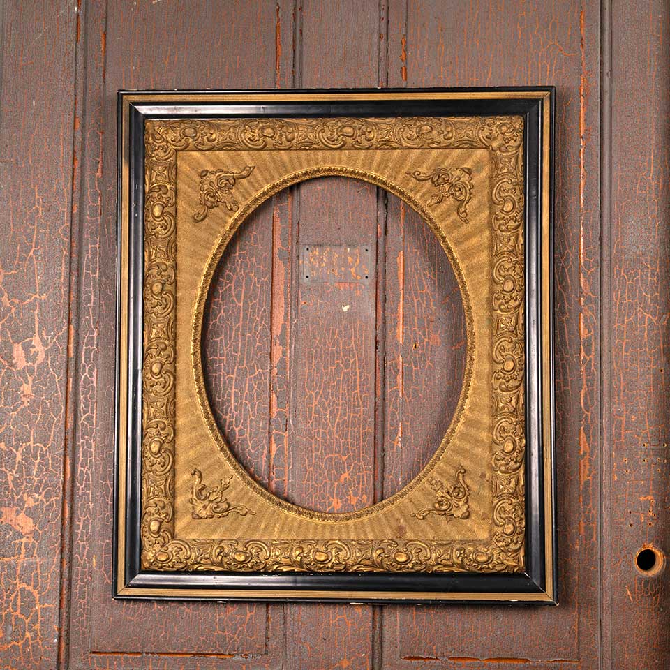 Ornate antique picture frame measuring approx. 25" wide x 29 1/8" tall x 1 3/8" front to back with an oval opening 15" wide x 19" tall. There's no glass in the opening. See photos to evaluate condition.