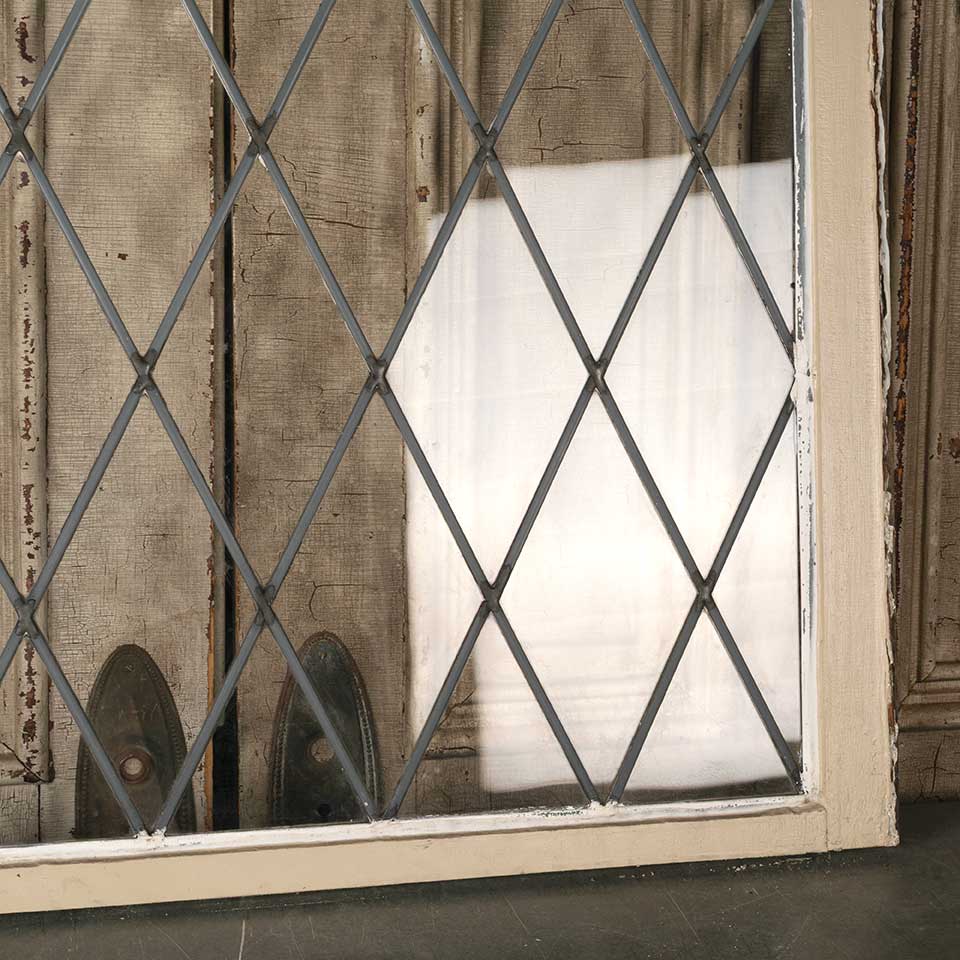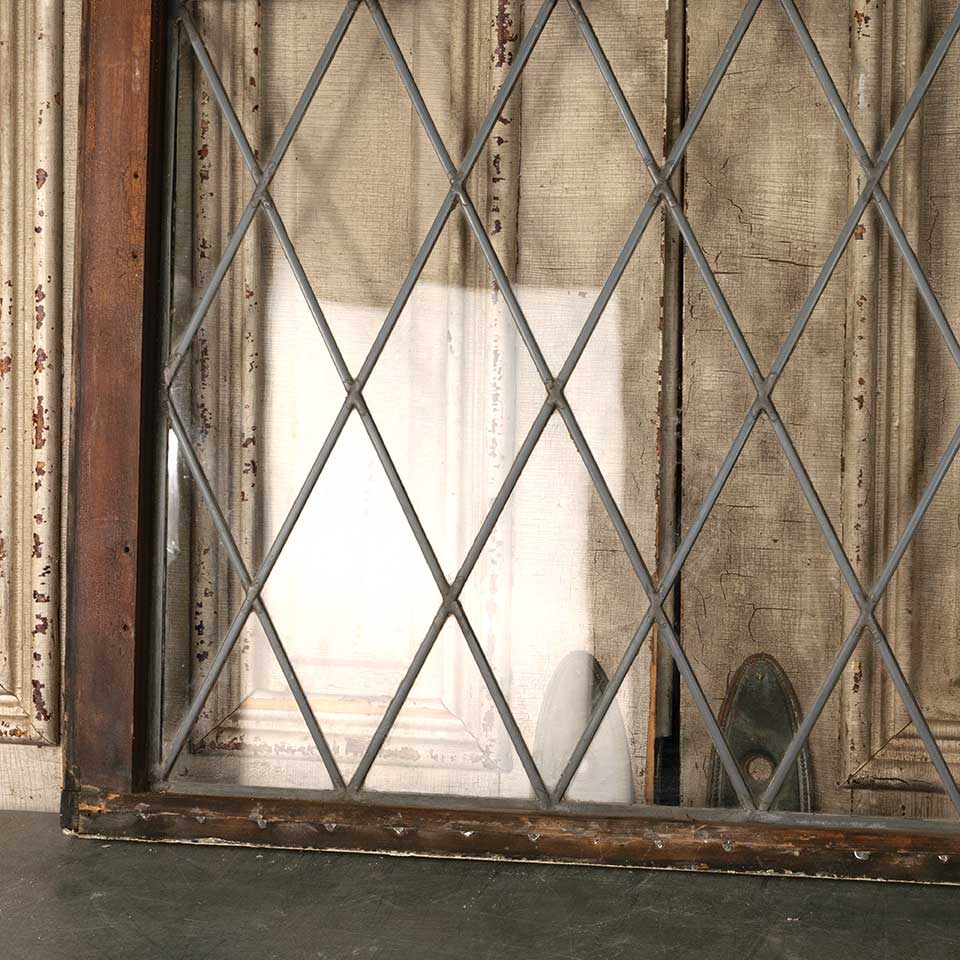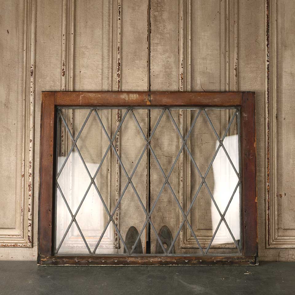 Architectural salvage antique leaded diamond paned window measuring approx. 34 3/8" wide x 27 3/8" tall x 1 3/8" thick. Color and condition may vary.