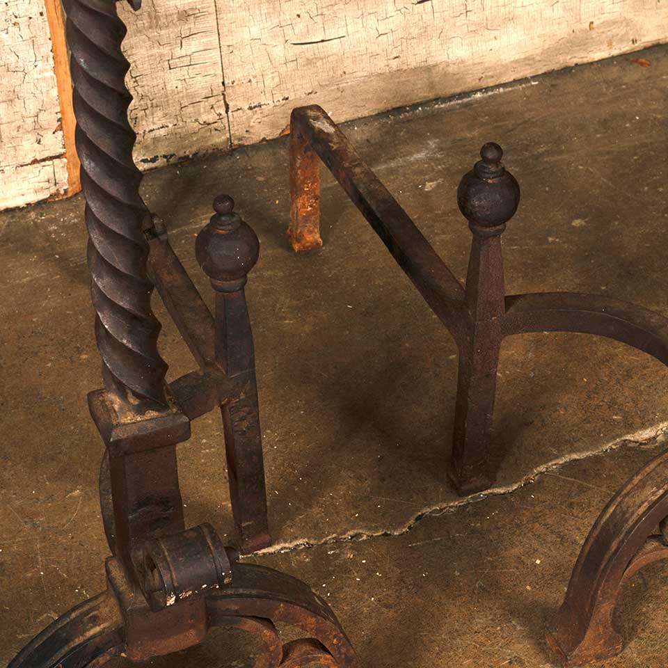 Set of two architectural salvage monumental antique hand forged wrought iron Gothic fireplace andirons each measuring approx. 12 1/2" wide (overall) x 30 1/2" tall x 26" front to back. One of the original screws that would have held a fireplace crane is missing. See photos to evaluate condition. Priced at $3,500 for the two piece set.