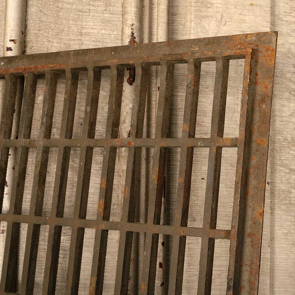 Architectural salvage antique cast iron cold air return floor grate vent cover measuring approx. 13 13/16" x 29 13/16" (insert dimensions) and 15 1/16" x 31 1/16" (overall dimensions). See photos to evaluate condition.