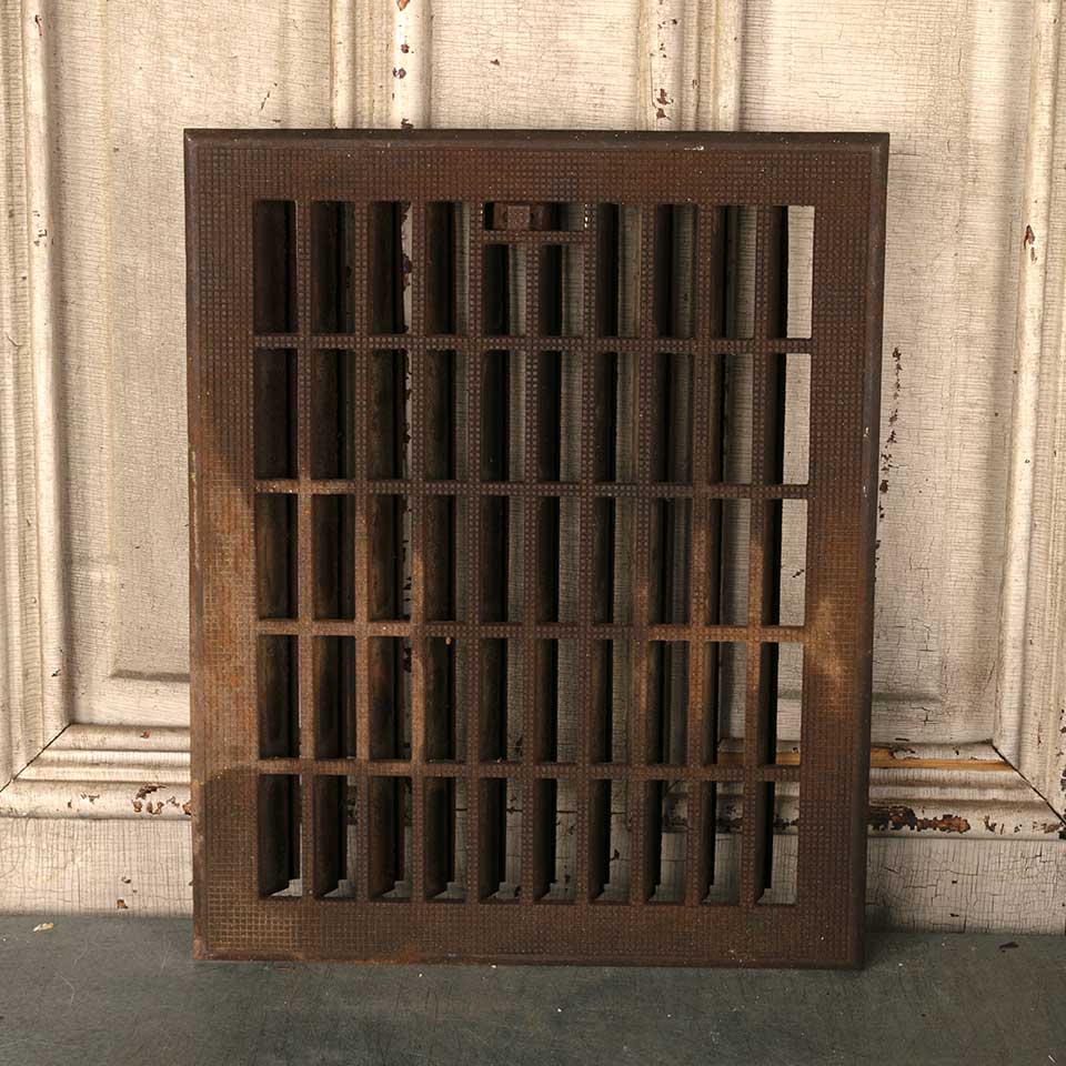 Architectural salvage antique cast iron heat grate floor register grille cover with operable louvers measuring approx. 11 7/8" x 14 7/8" (insert dimensions) and 13 3/4" x 16 13/16" (overall dimensions). See photos to evaluate condition.
