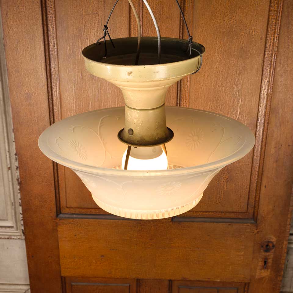 Architectural salvage vintage single bulb flush mount light fixture with pressed glass shade measuring approx. 10 1/2" in diameter x 9" tall with a 5 1/2" diameter ceiling canopy. See photos to evaluate condition. Salvaged lighting should be inspected by a licensed electrician prior to installation.