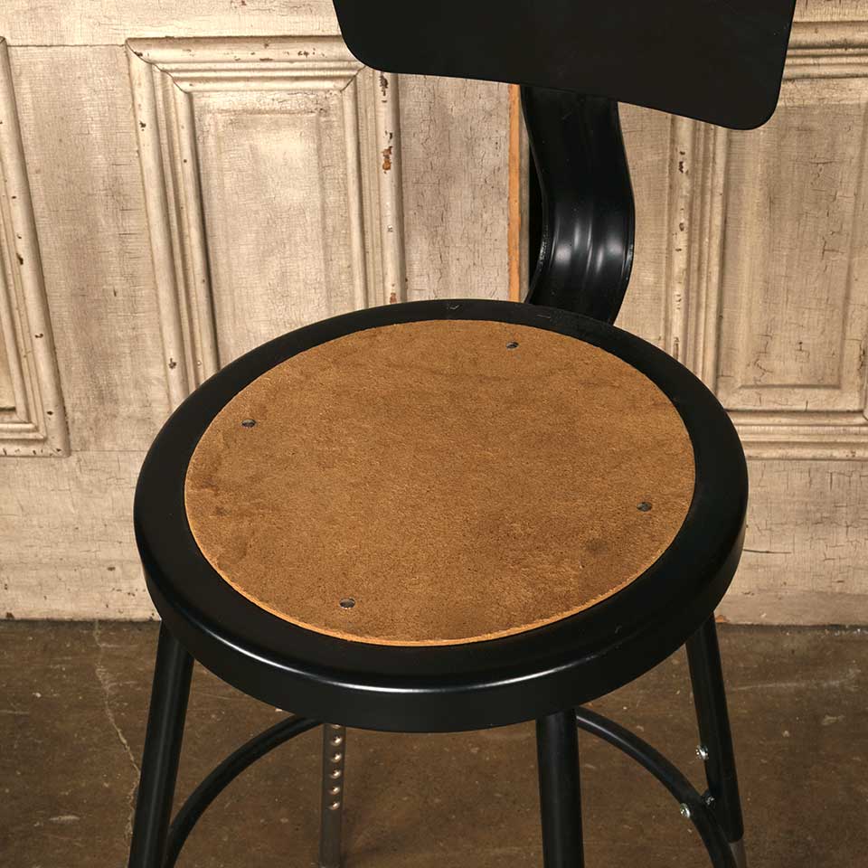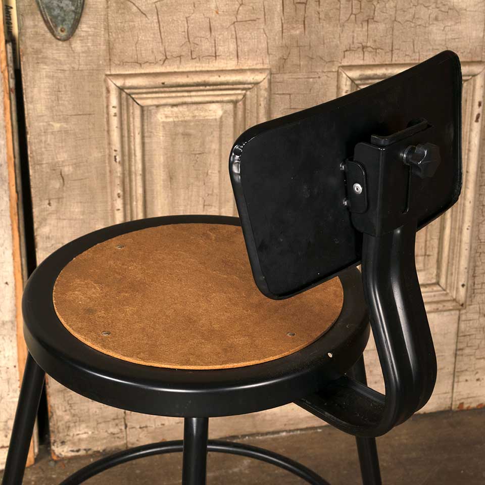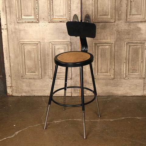Adjustable metal work stool measuring approx. 17" wide x 38" tall (at currently set height) x 21" front to back. See photos to evaluate condition.