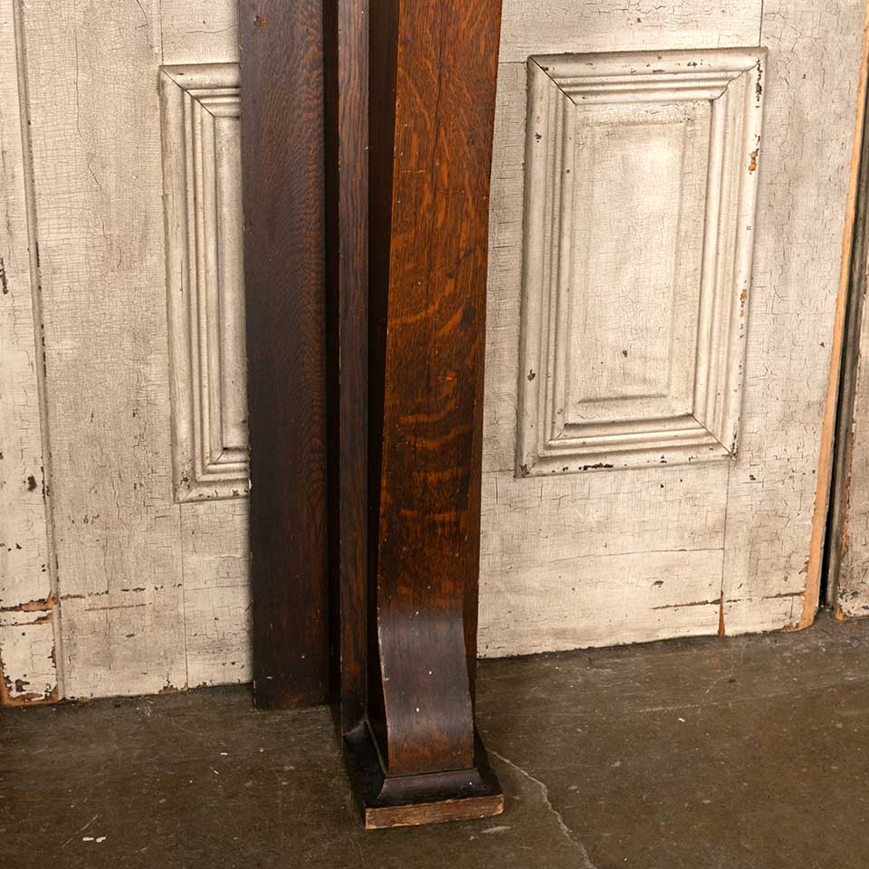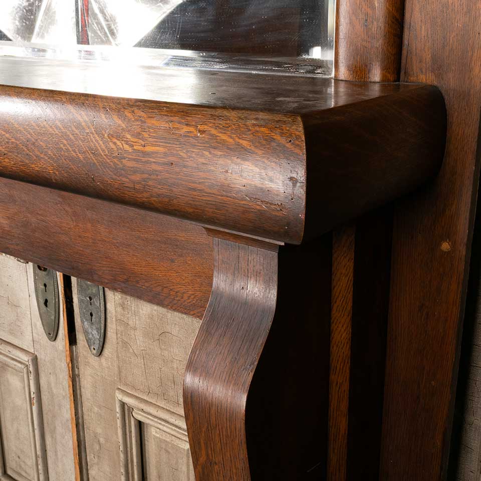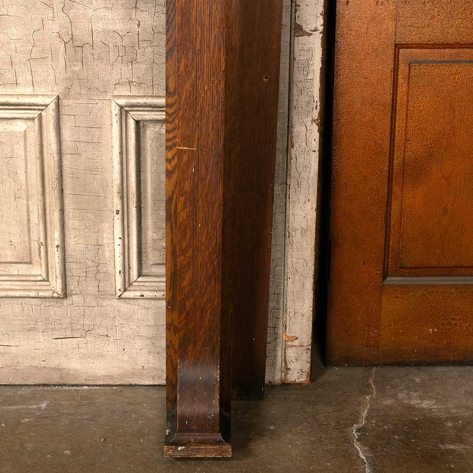 Architectural salvage antique oak wood fireplace mantel / mantle with beveled glass mirror measuring approx. 59" wide x 68 1/2" tall x 12" front to back. The interior firebox opening measures approx. 41 1/2" wide x 38 3/4" tall. See photos to evaluate condition.