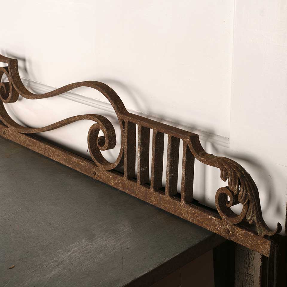 Architectural salvage antique wrought iron ornamental pediment measuring approx. 84 1/2" wide x 8 1/8" tall x 2" front to back. See photos to evaluate condition.