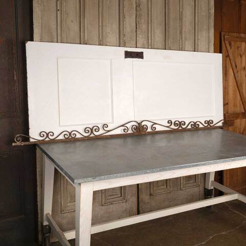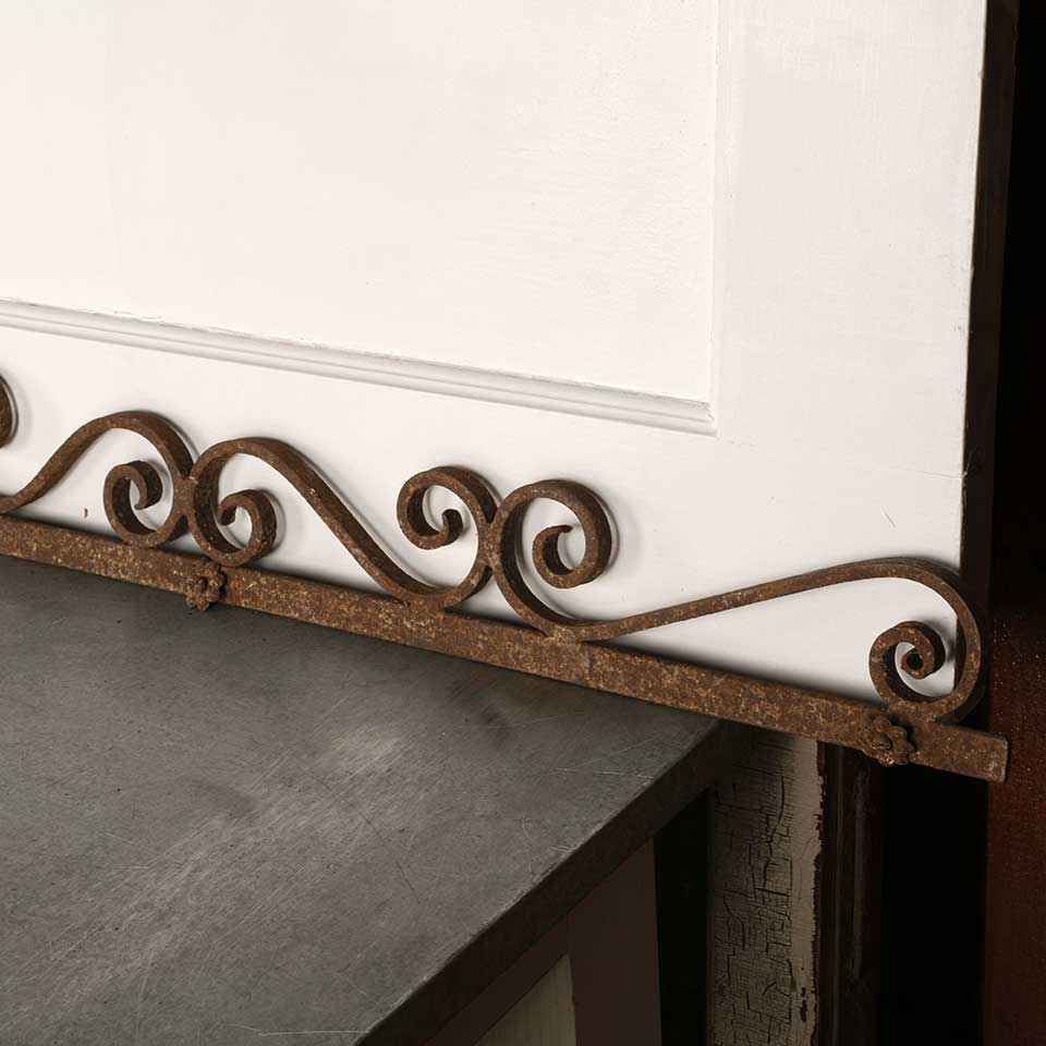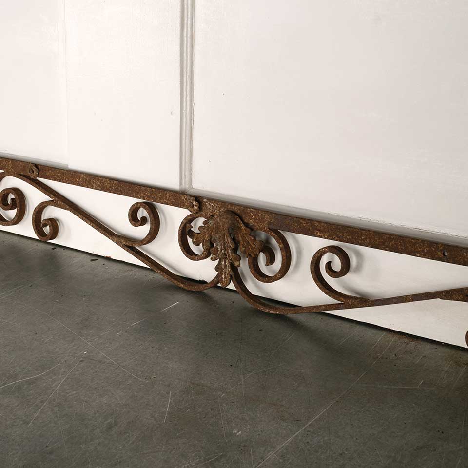 Architectural salvage antique wrought iron ornamental pediment measuring approx. 84 1/8" wide x 4 7/8" tall x 1" front to back. See photos to evaluate condition.