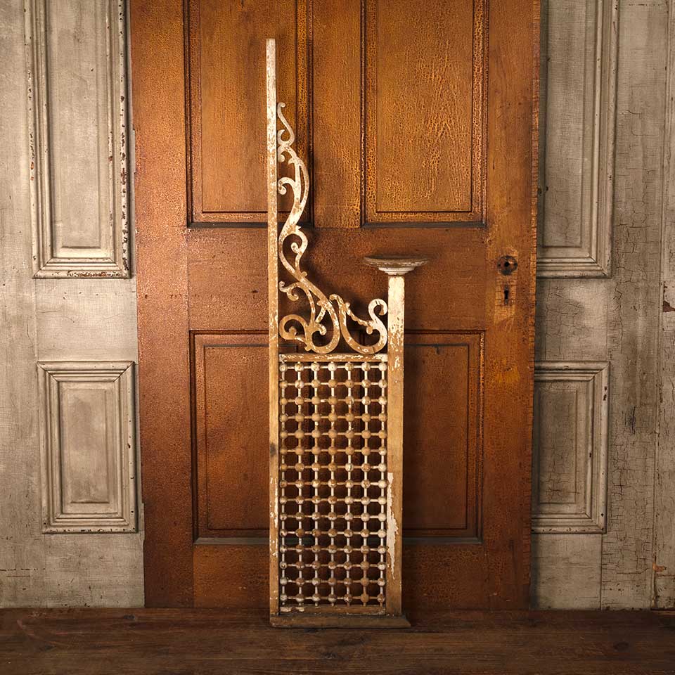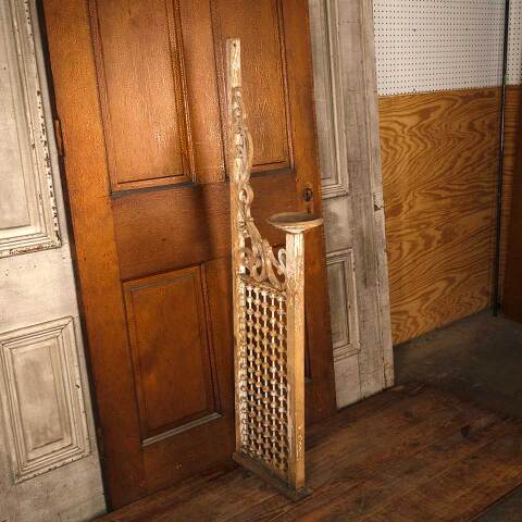 Architectural salvage antique Victorian painted oak wood interior stick and ball fretwork door panel with dish / plant stand measuring approx. 6 5/8" wide (dish) x 56" tall x 15 3/8" front to back. See photos to evaluate condition.