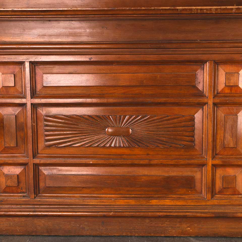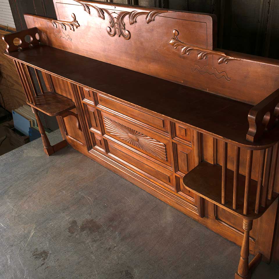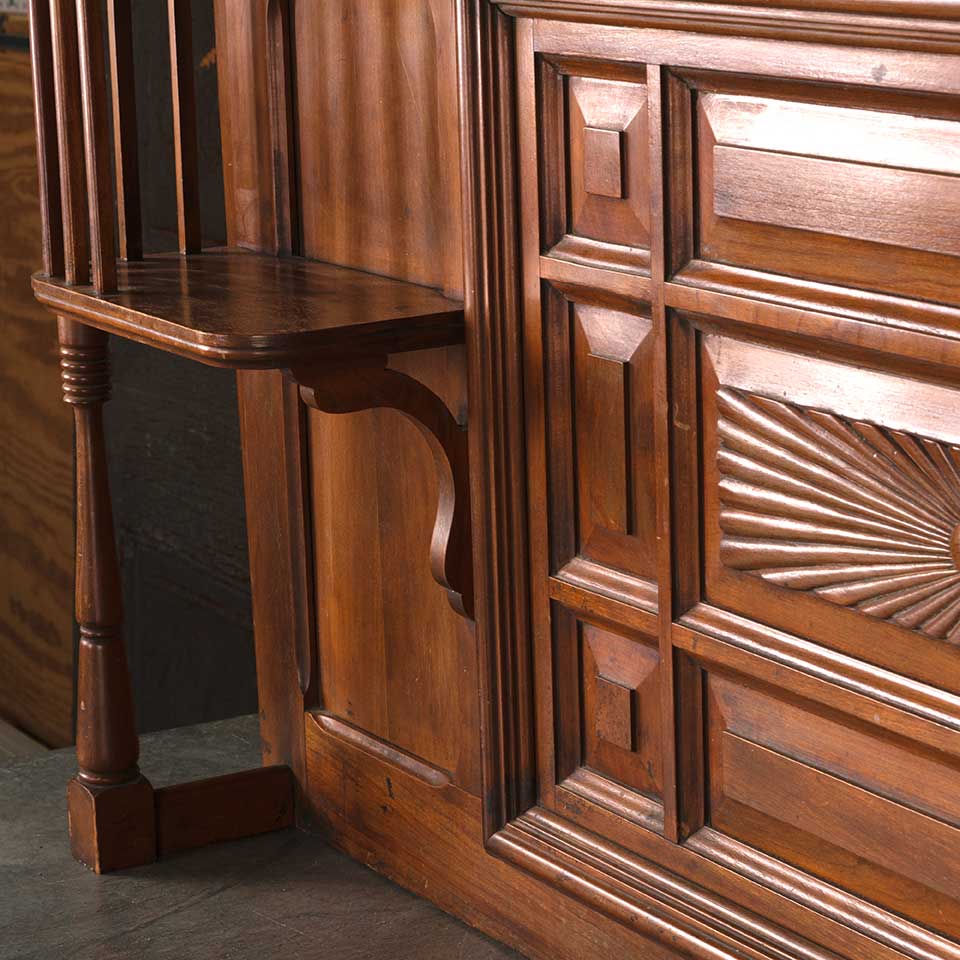 Architectural salvage antique wood fireplace overmantel shelf measuring approx. 57" wide x 31 7/8" tall x 8" front to back. See photos to evaluate condition.