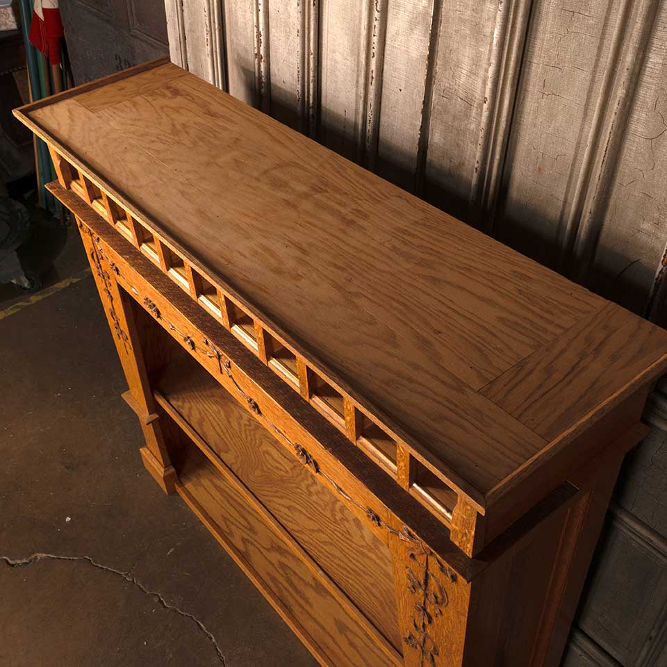 Handcrafted oak back bar cabinet measuring approx. 50 1/8" wide x 46 3/8" tall x 14 1/4" front to back. This cabinet was constructed from pieces of an antique fireplace mantel. See photos to evaluate condition.