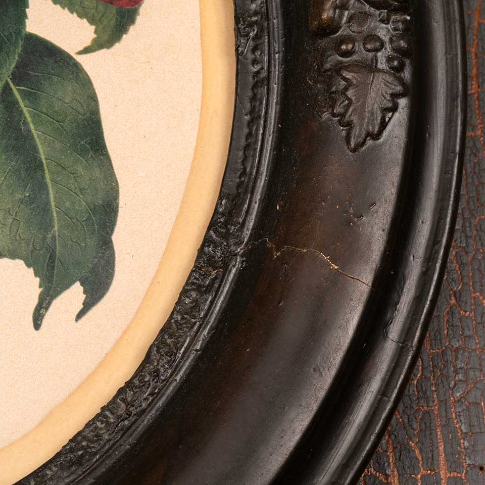 Antique botanical print of Camellia Japonica corallina in oval frame measuring approx. 12" wide x 14" tall x 1 1/8" front to back. See photos to evaluate condition.