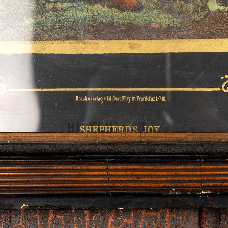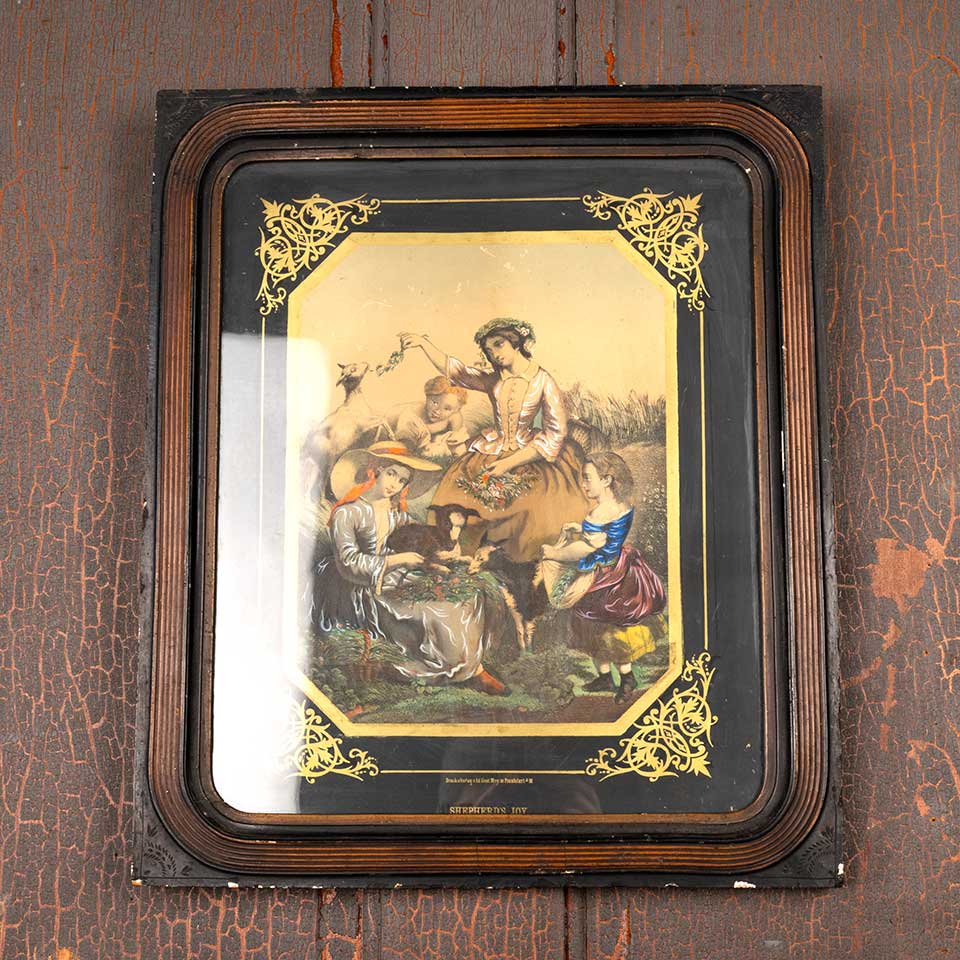 Antique color print entitled "SHEPHERD'S JOY" in Victorian frame measuring approx. 17" wide x 20" tall x 7/8" front to back. See photos to evaluate condition.