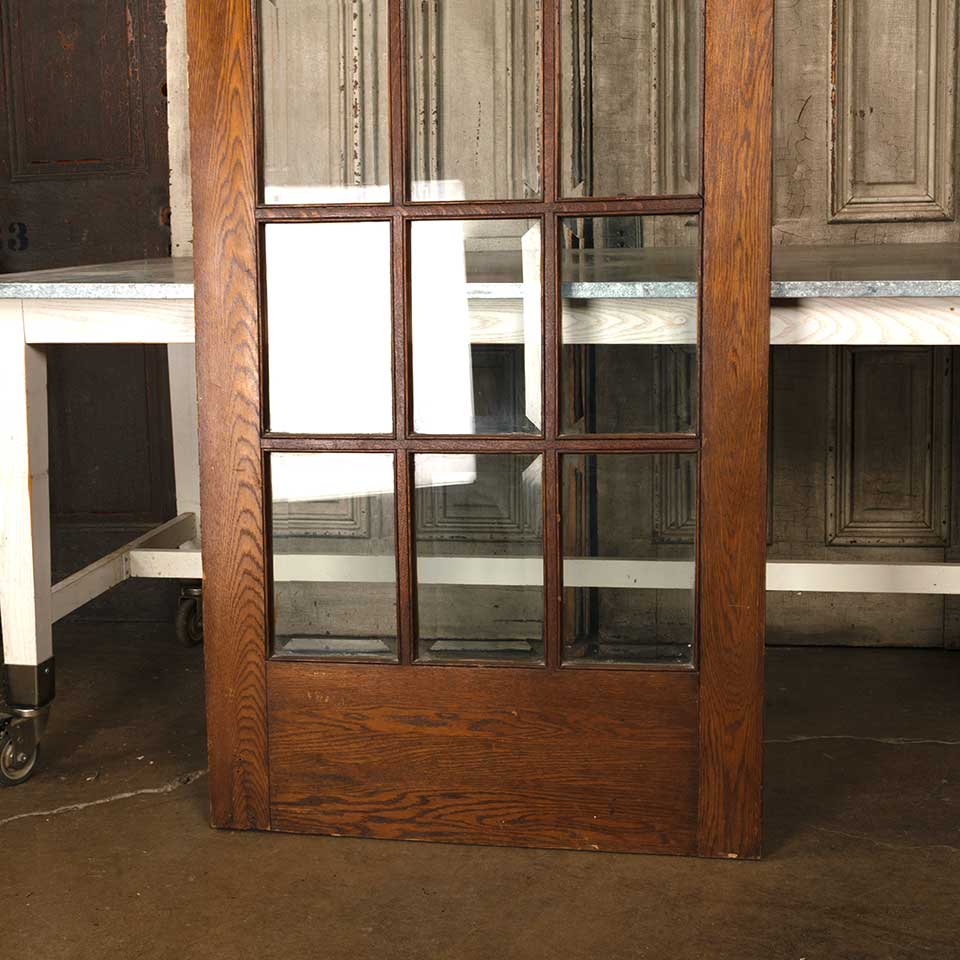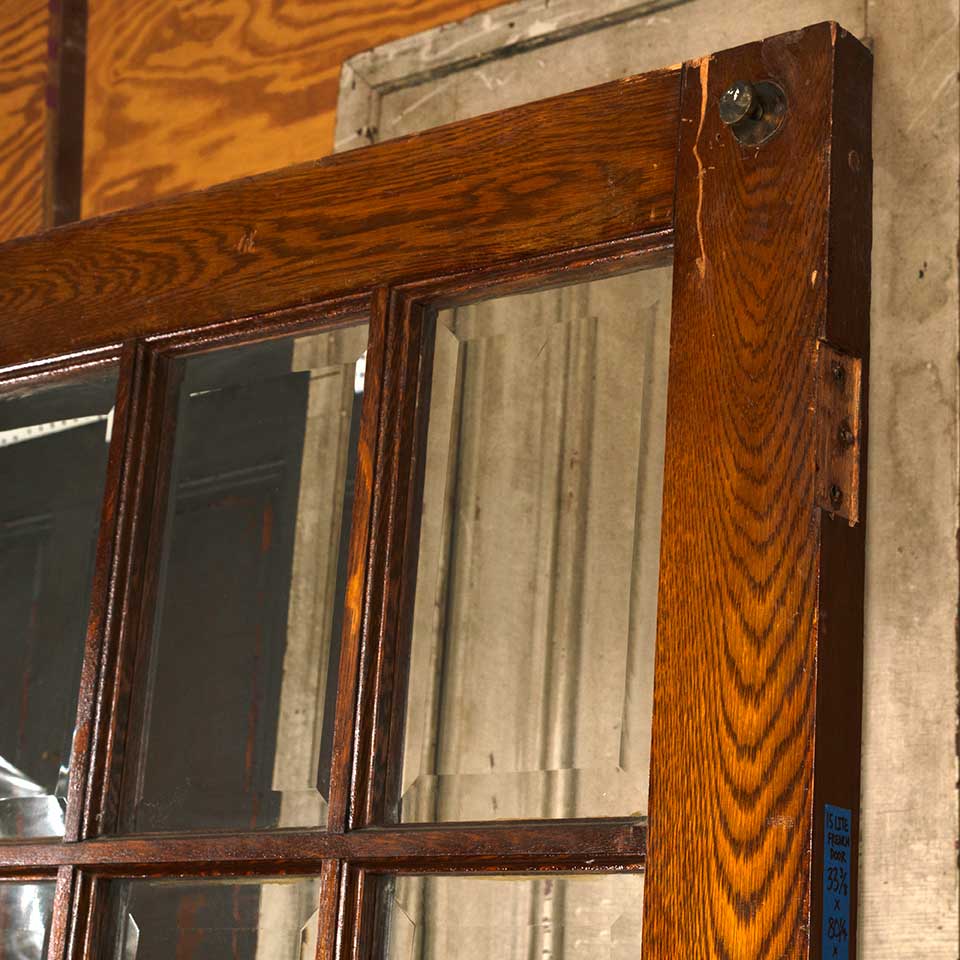 Architectural salvage antique oak fifteen lite interior French door with beveled glass panels measuring approx. 33 3/8" wide x 80 1/8" tall x 1 3/4" thick. The bottom was cut to fit the slope of the floor and height goes from 80 1/8" on one side to 80 3/4" on the other. There are hinge pockets on both edges of the door. See photos to evaluate condition.