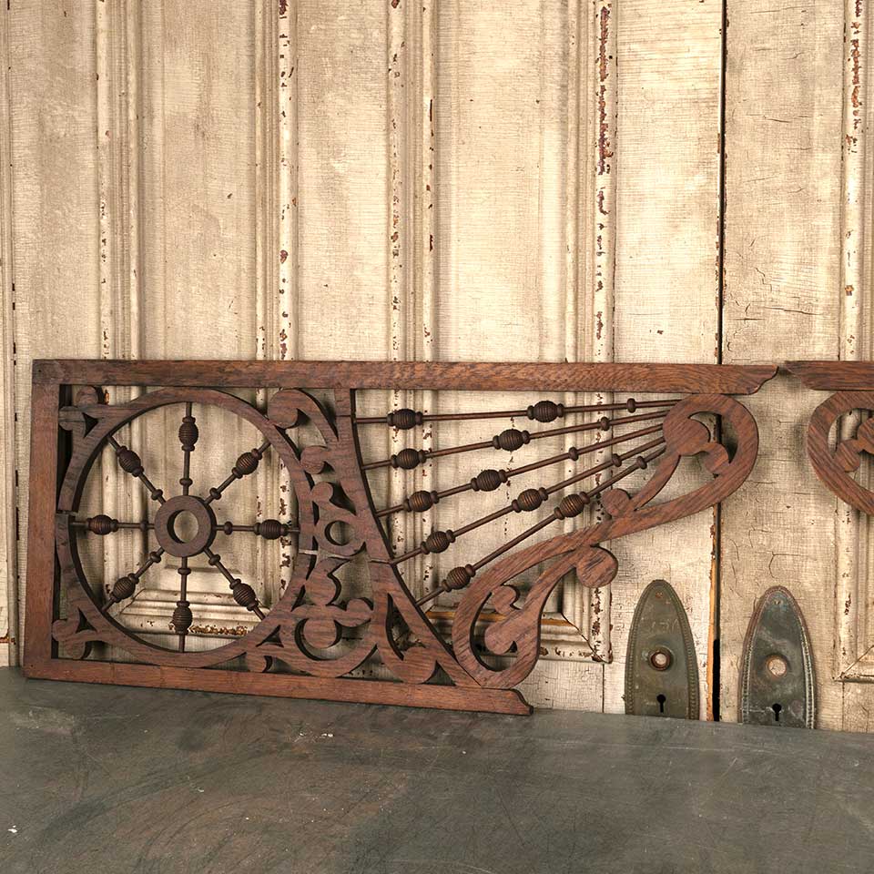 Set of two architectural salvage antique oak Victorian interior stick and ball fretwork panels each measuring approx. 15" wide x 34" tall x 3/4" thick. See photos to evaluate condition. Priced at $575 for the two piece set.