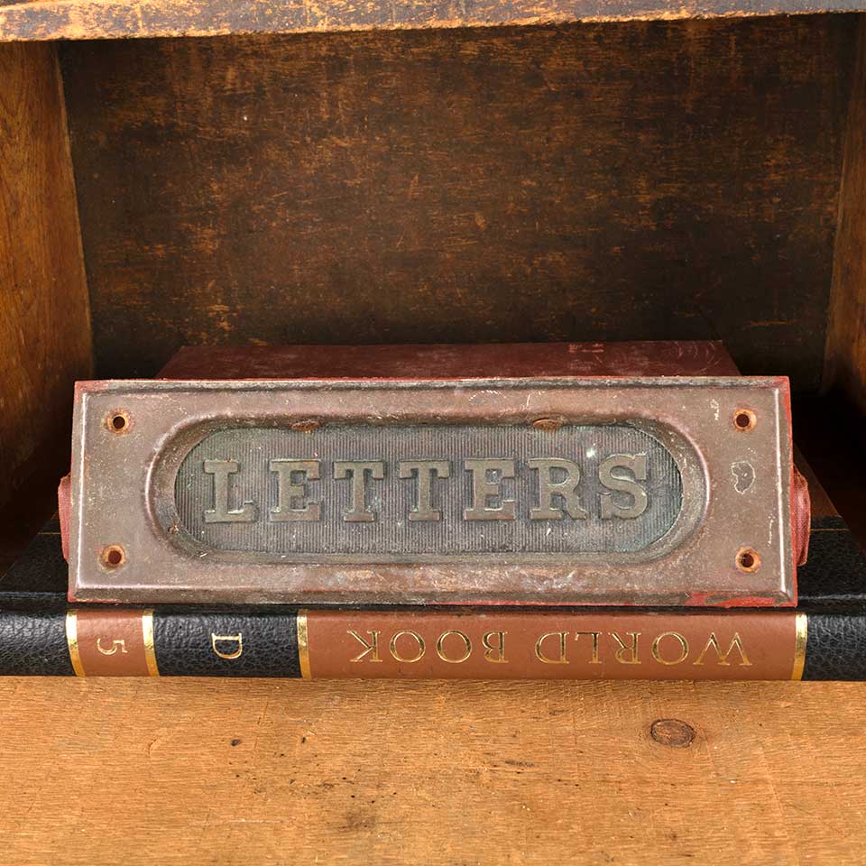 Architectural salvage antique brass entry door mail slot hardware with hinged LETTERS flap measuring approx. 8" wide x 2 1/2" tall x 1/2" front to back with an opening 5 3/4" wide x 1 1/2" tall. See photos to evaluate condition.