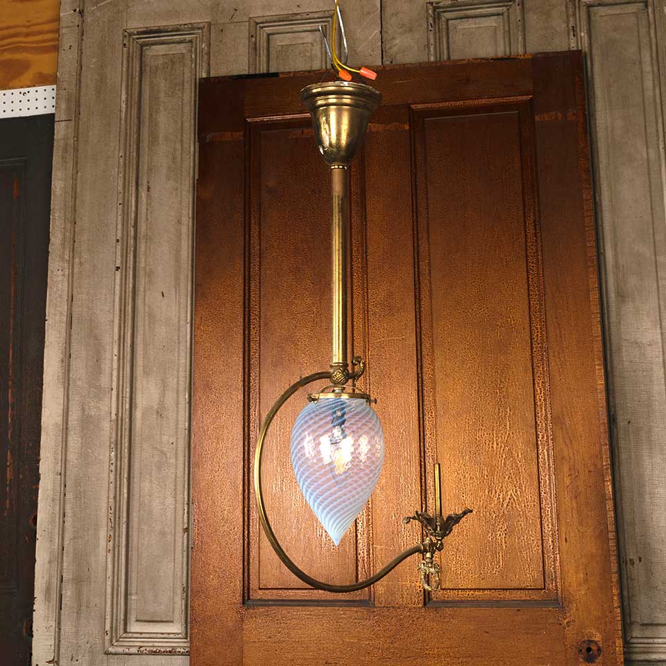 Architectural salvage antique brass Victorian combination gas and single bulb electric light fixture chandelier with swirled glass globe measuring approx. 14" wide x 27" tall x 5" front to back with a 4 1/2" diameter canopy, Salvaged lighting should be inspected by a licensed electrician prior to installation.