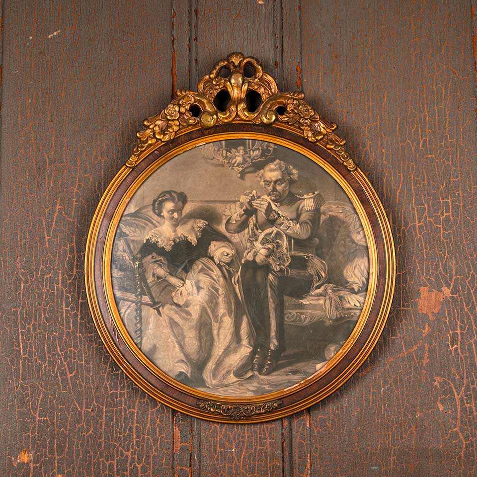 Antique print in ornate round picture frame measuring approx. 17 3/8" wide x 20 7/8" tall x 3/4" front to back. There's some loss of the finish. See photos to evaluate condition.
