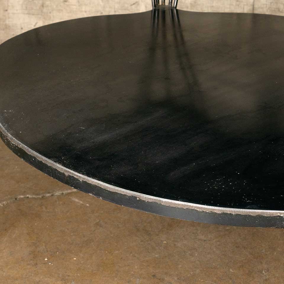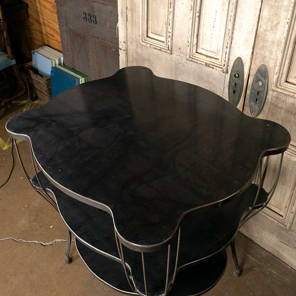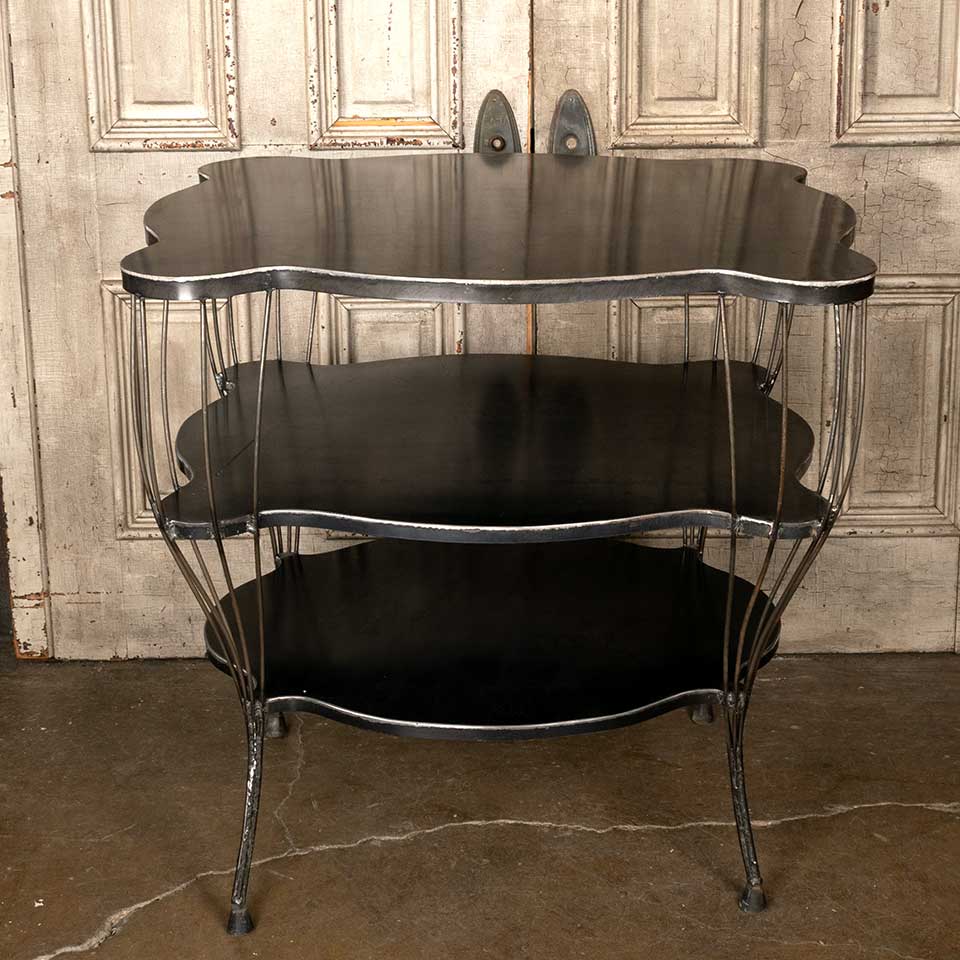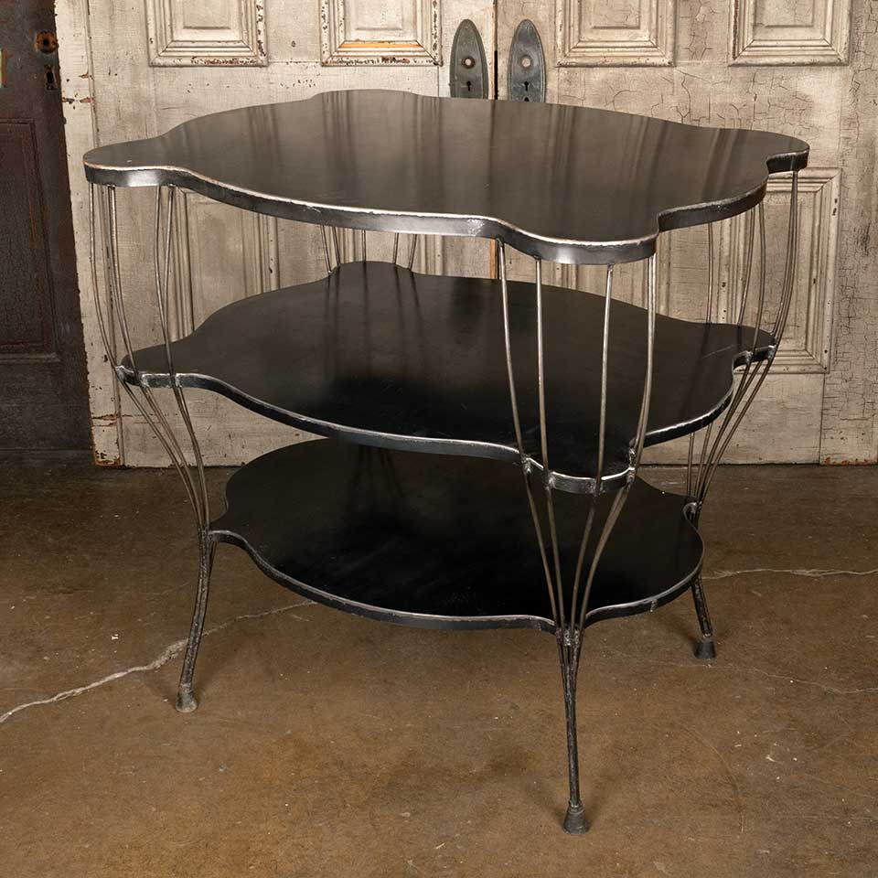 Artist made contemporary three tier metal table measuring approx. 36 1/4" wide x 35 3/4" tall x 30 1/4" front to back. See photos to evaluate condition.