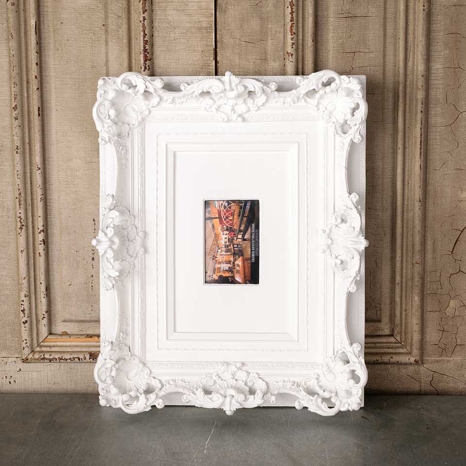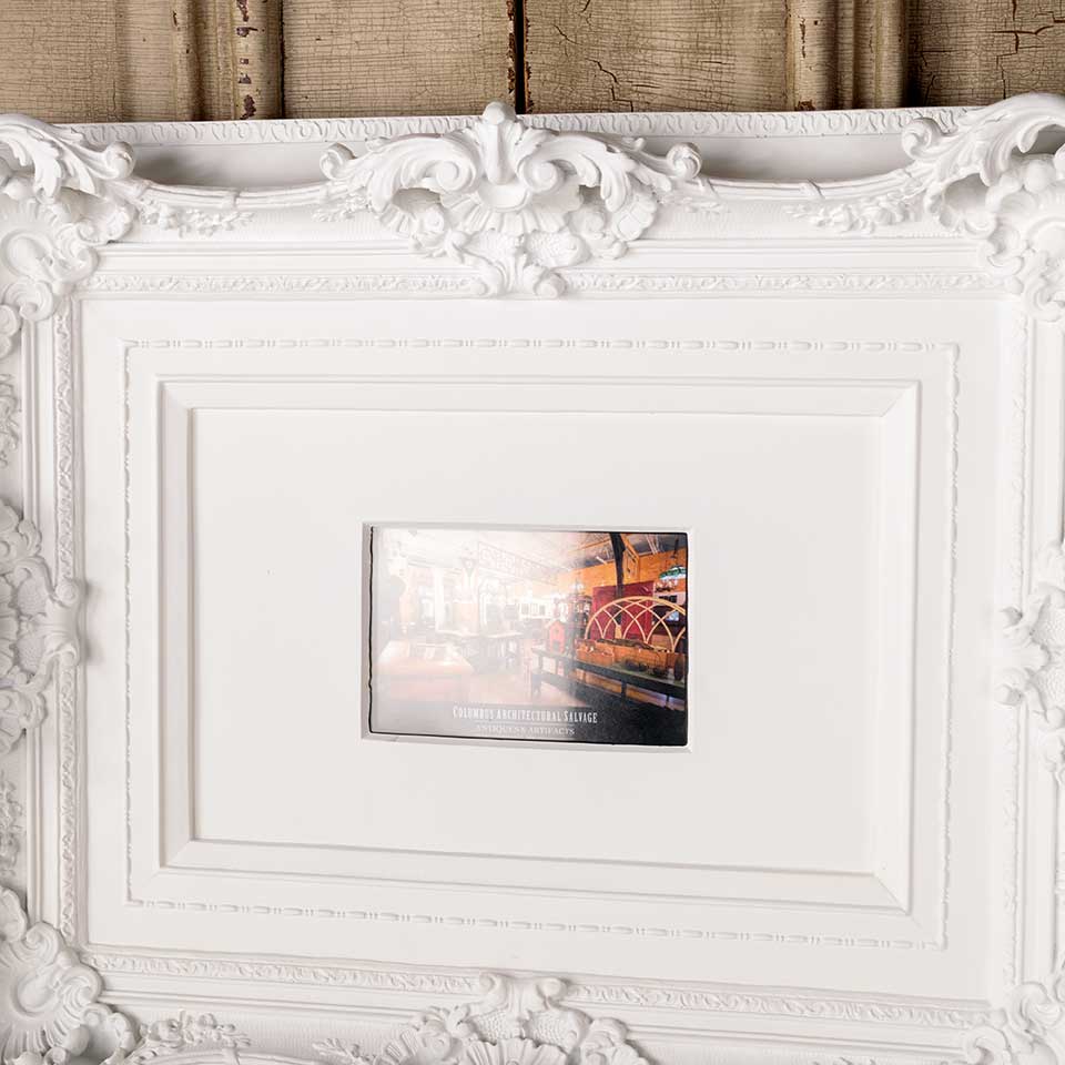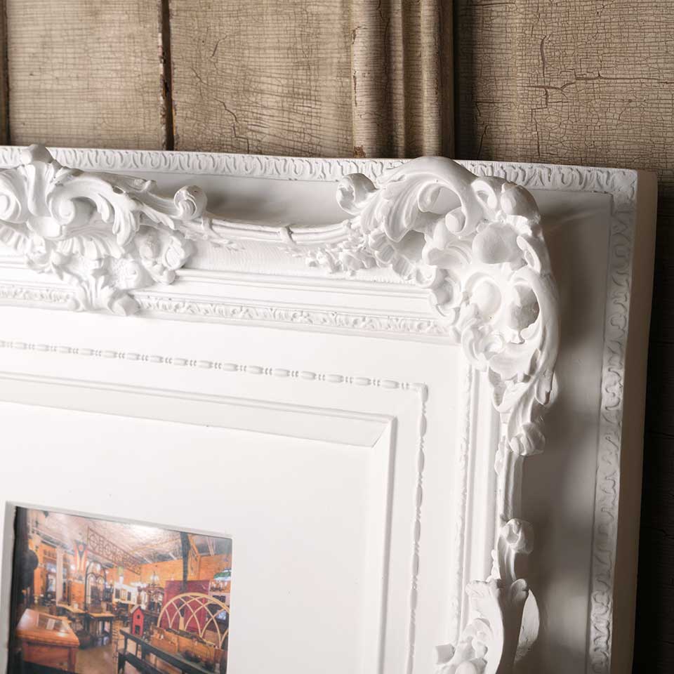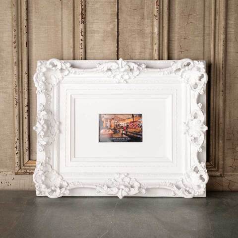 Ornate modern picture frame measuring approx. 22 3/8" x 18" x 3 1/2" front to back with an opening approx. 5 3/4" x 3 3/4". Color and condition may vary.
