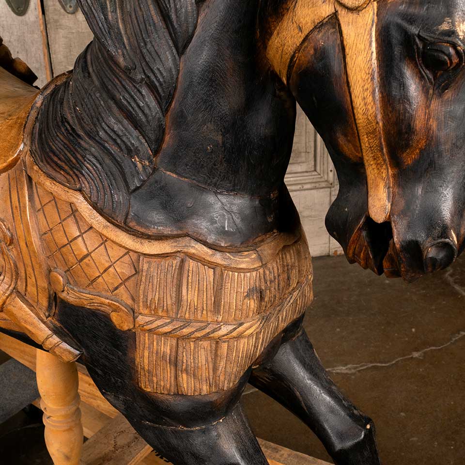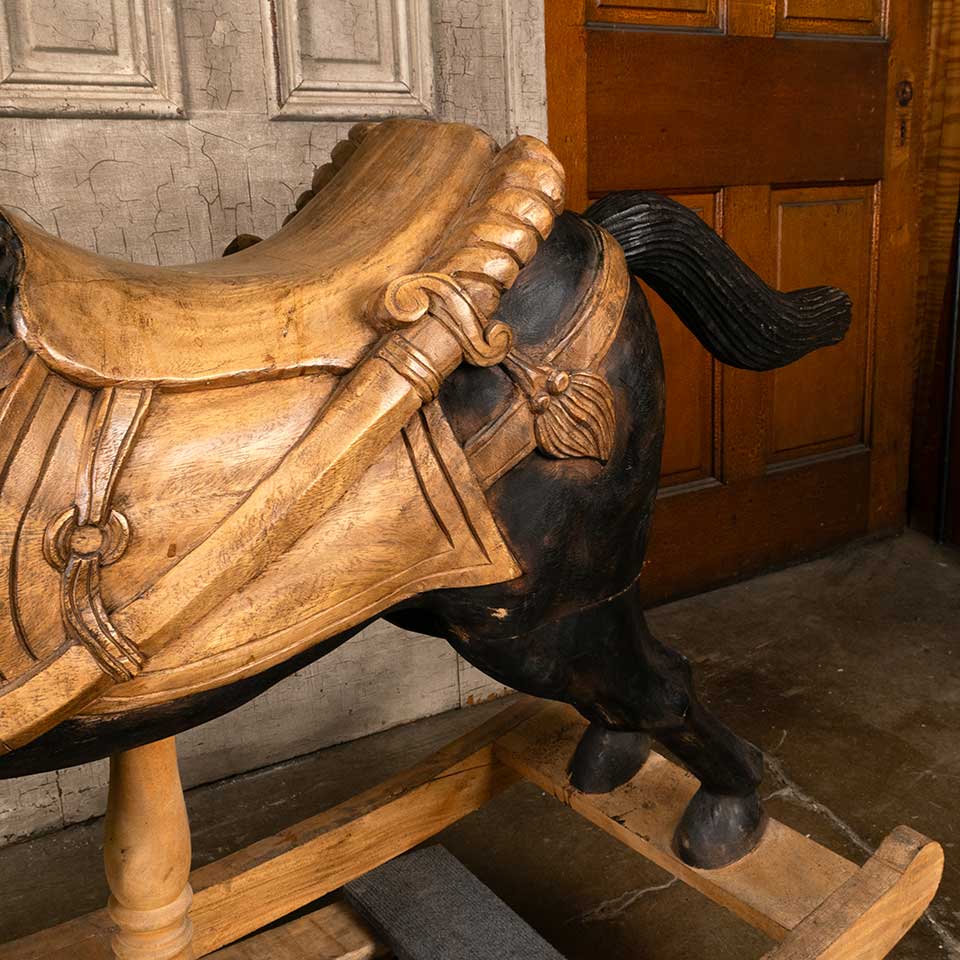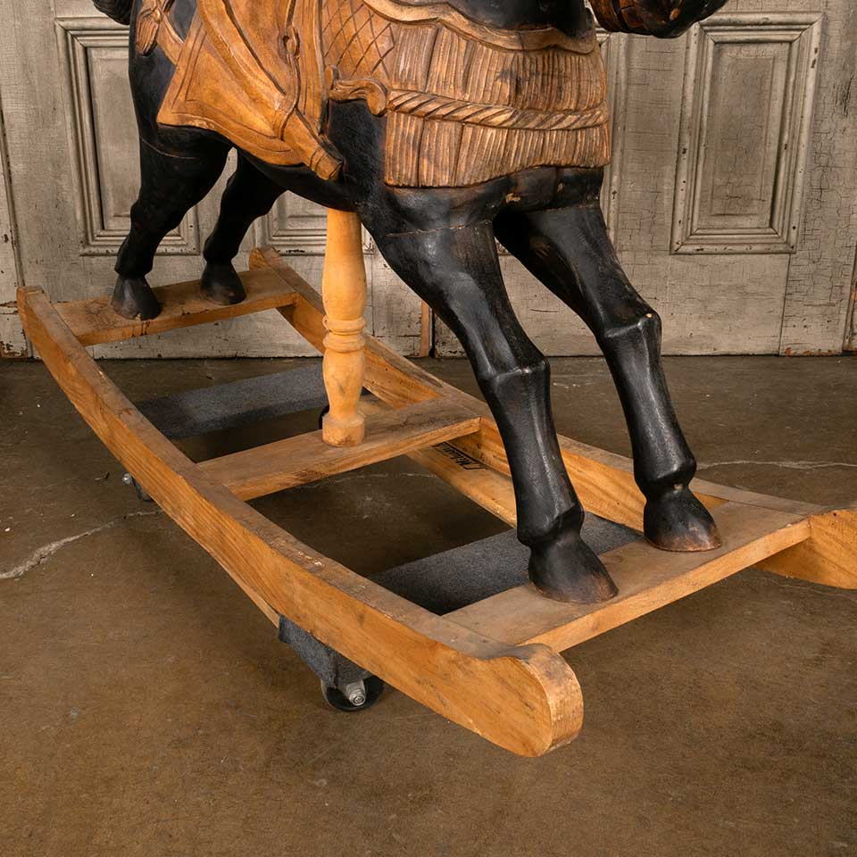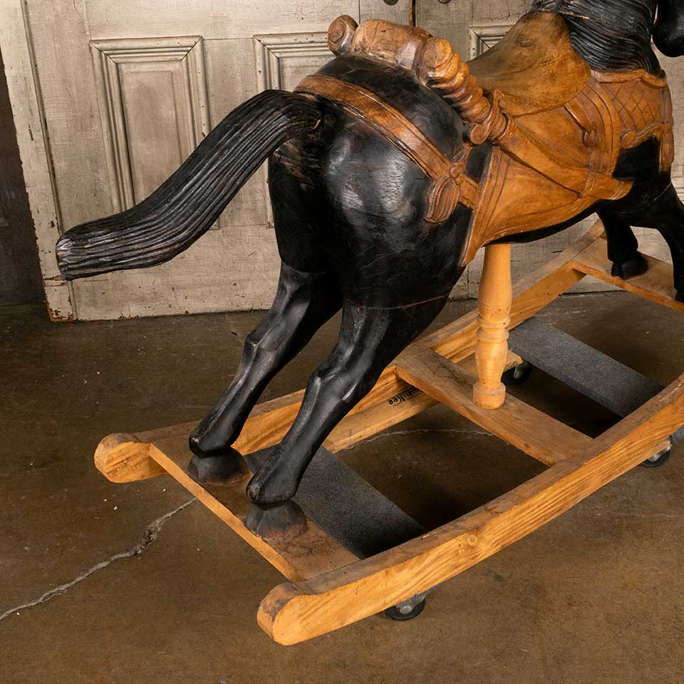 Painted carved wood rocking horse measuring approx. 18 5/8" wide x 39" tall x 56 1/2" front to back. See photos to evaluate condition.
