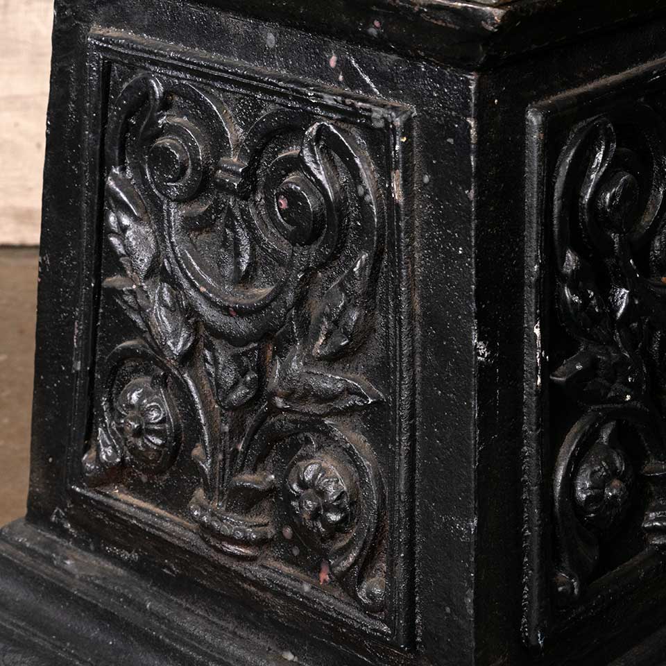 Architectural salvage three piece painted cast iron garden planter urn and pedestal set. The urn measures approx. 19 1/2" in diameter x 17 1/4" tall with a 9" x 9" base and the pedestal measures approx. 17 1/4" tall with an 11" x 11" top and a 14 3/4" x 14 3/4" base. The top of the pedestal base is a separate piece. Color and condition may vary. Priced at $1,150/ 3 piece set.