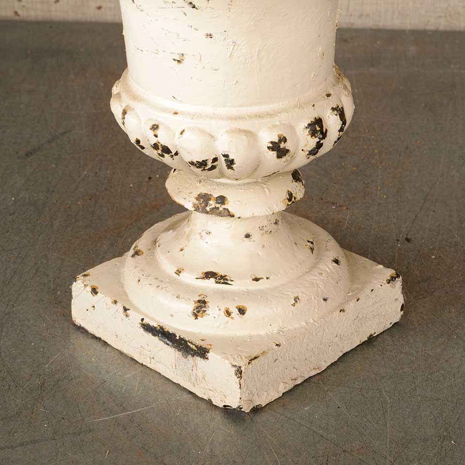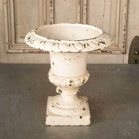 Architectural salvage painted cast iron garden planter urn measuring approx. 11 1/2" diameter x 12 1/2" tall with a 5 7/8" x 5 7/8" base. Color and condition may vary.