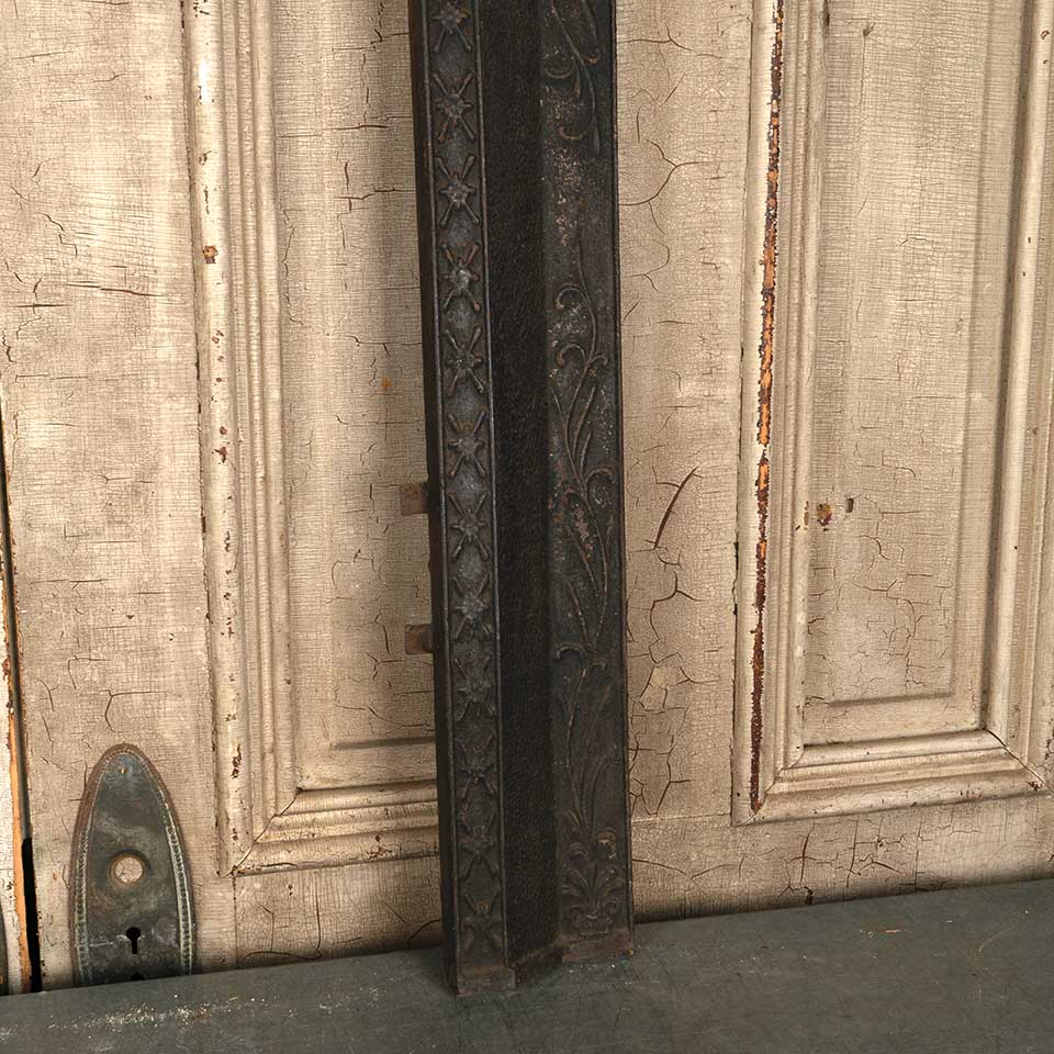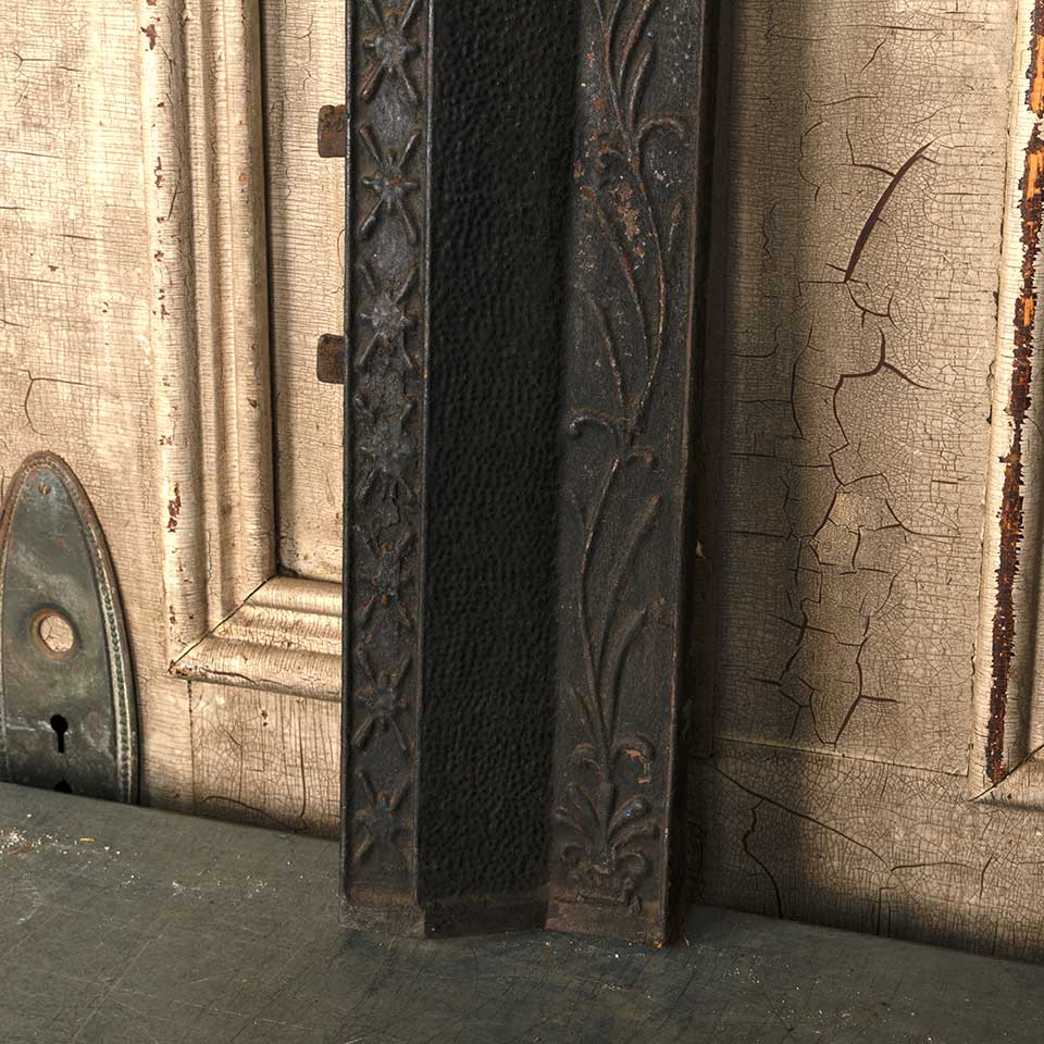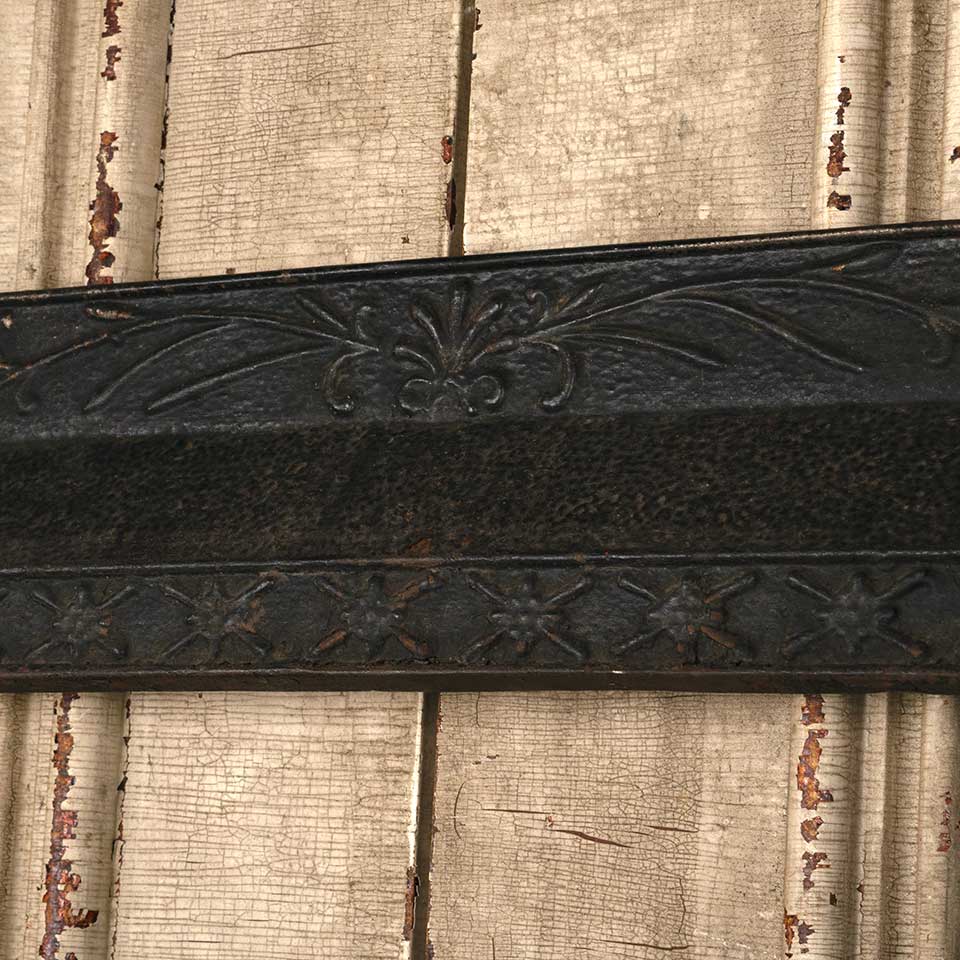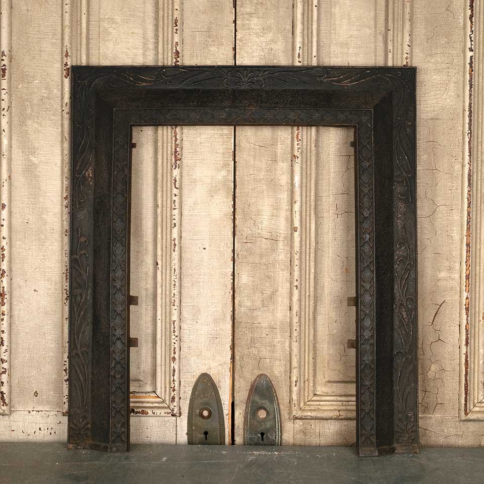 Architectural salvage antique cast iron fireplace surround measuring approx. 28 3/16" wide x 31 3/16" tall x 1 3/4" front to back. The interior firebox opening measures approx. 17 7/8" wide x 26 1/16" tall. See photos to evaluate condition.