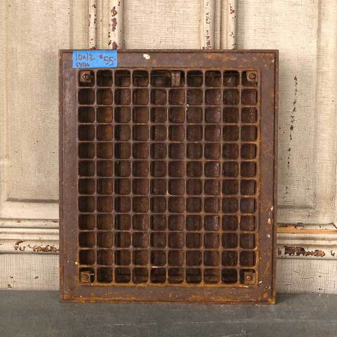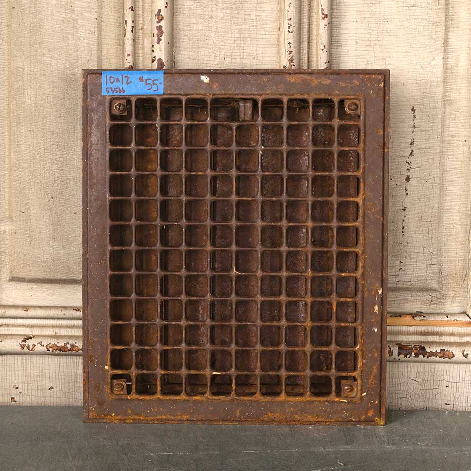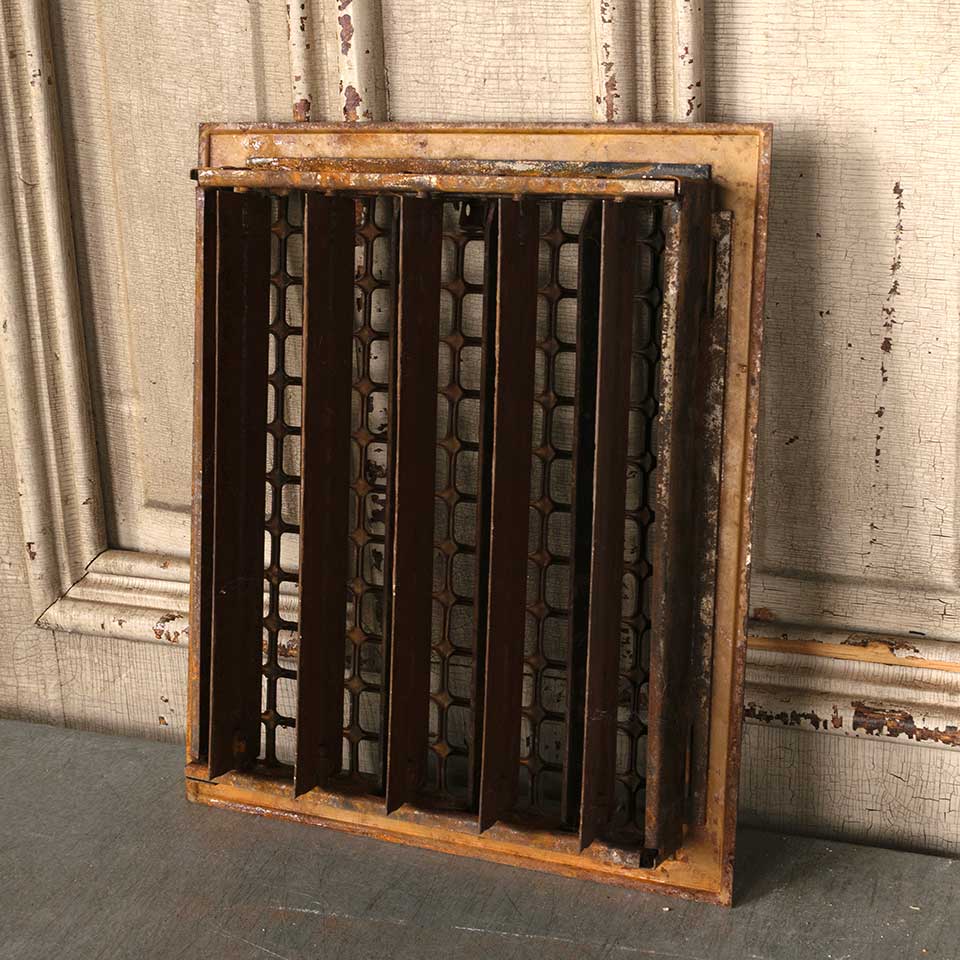 Architectural salvage antique pressed / stamped metal heat grate floor vent cover with operable louvers measuring approx. 10" x 12" (insert dimensions) and 12" x 14" (overall dimensions). See photos to evaluate condition.