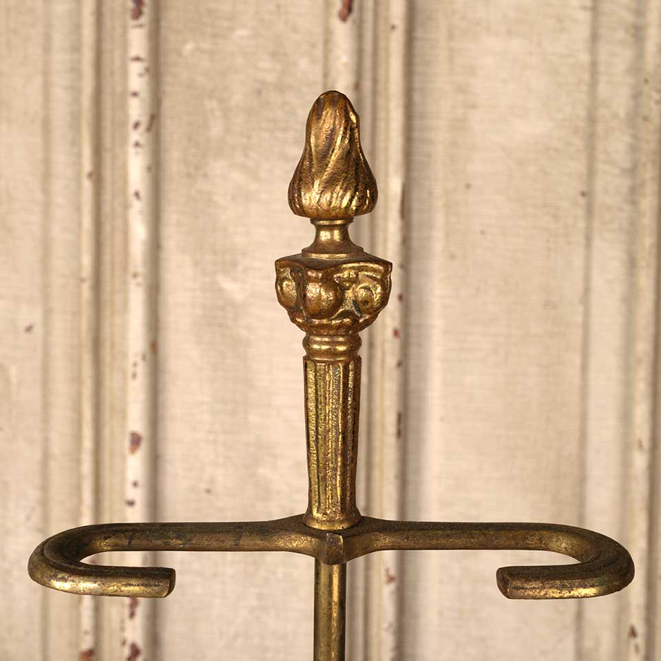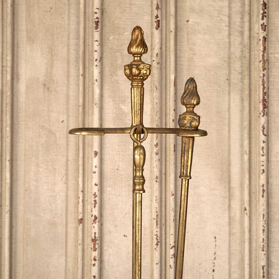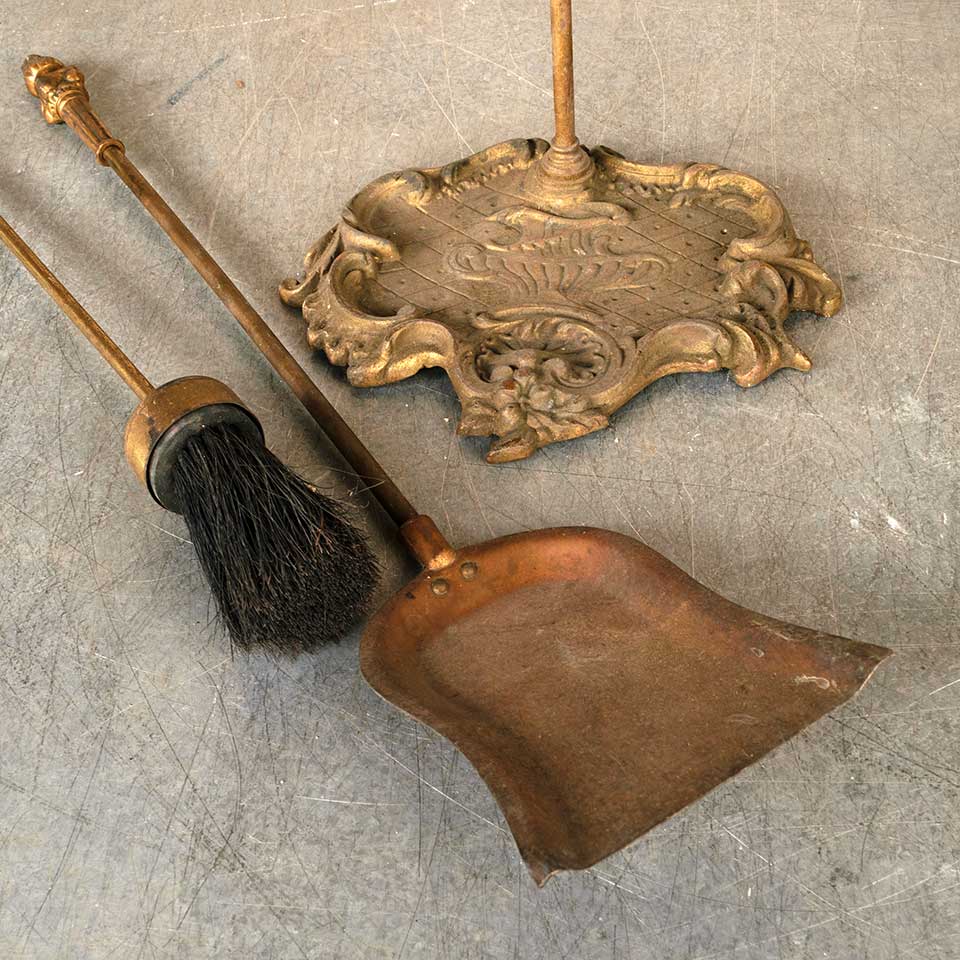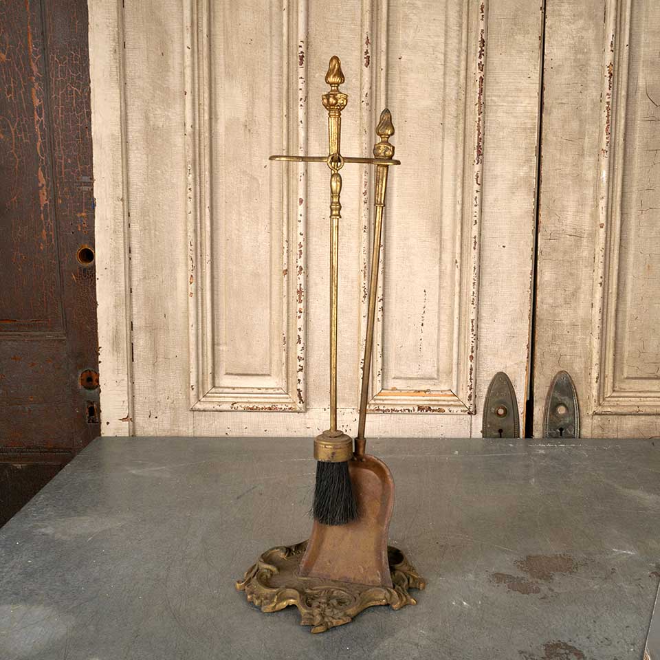 Antique brass fireplace tool set and stand measuring approx. 10 1/4" wide x 28" tall x 9 1/8" front to back. Set includes an ash shovel, brush and stand. See photos to evaluate condition. Priced at $175 for the 3 piece set.